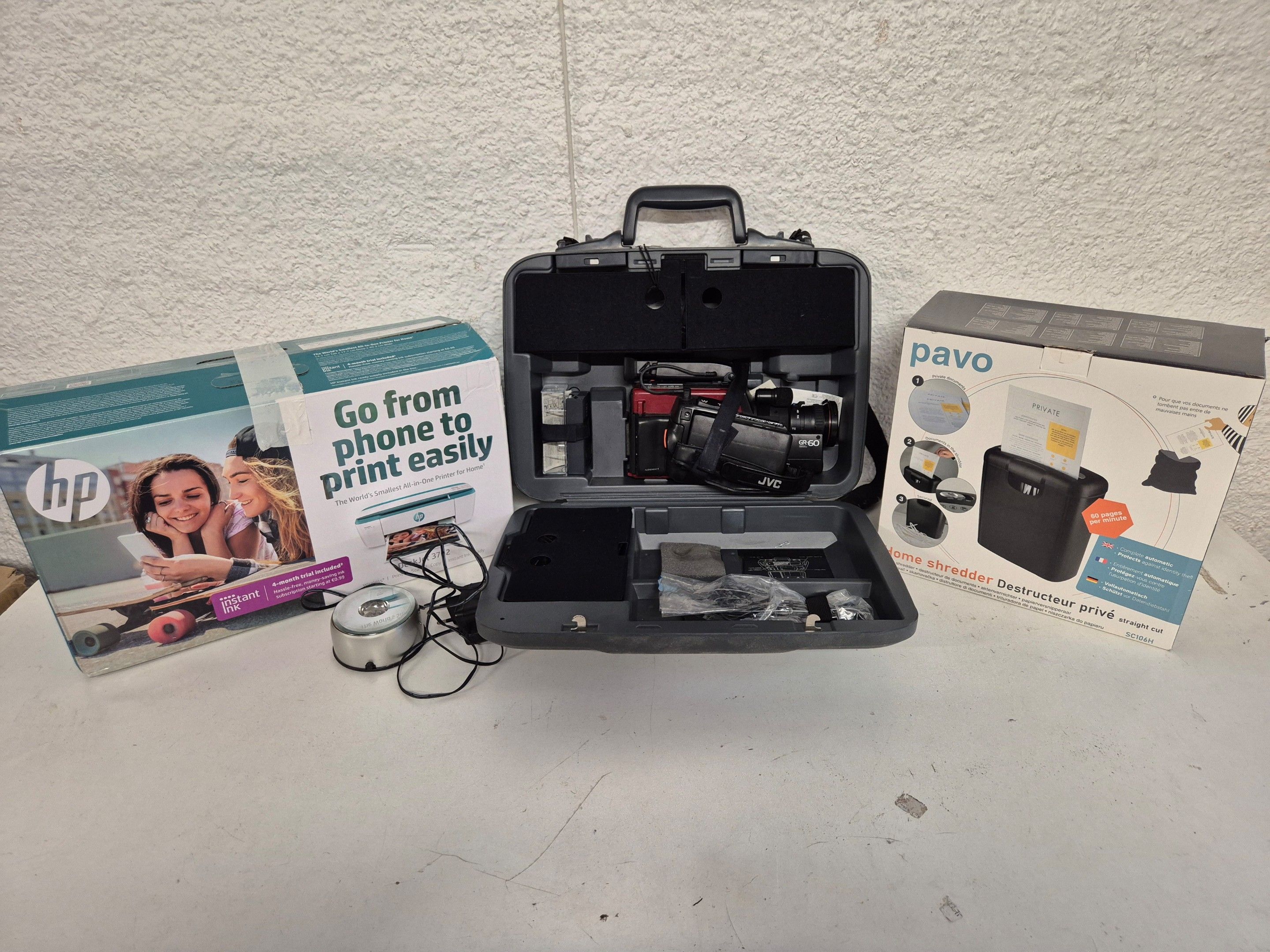 J/ JVC GR 60 camcorder in case, HP Deskjet 3762 printer and 1 PAVO paper shredder.
