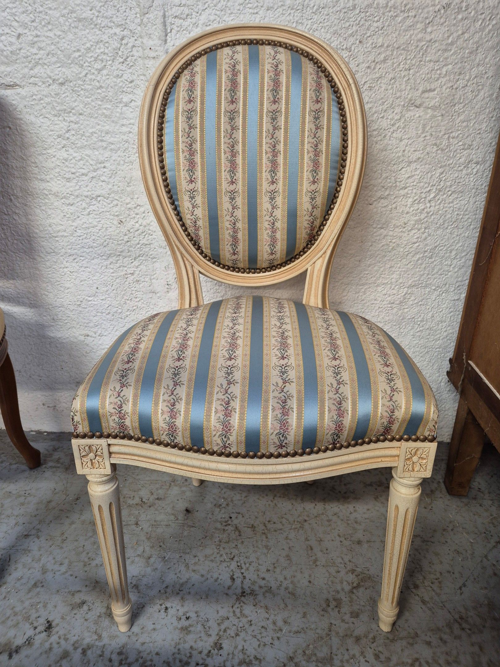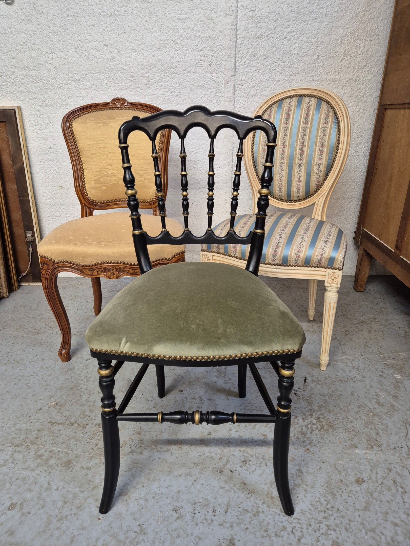 J/ Louis XV style cherrywood chair upholstered in yellow fabric, 2 Napoleon III style chairs in blackened wood upholstered in green velvet (modern work) and Louis XVI style medallion chair in relacquered wood upholstered in fabric with stripes and flowers.