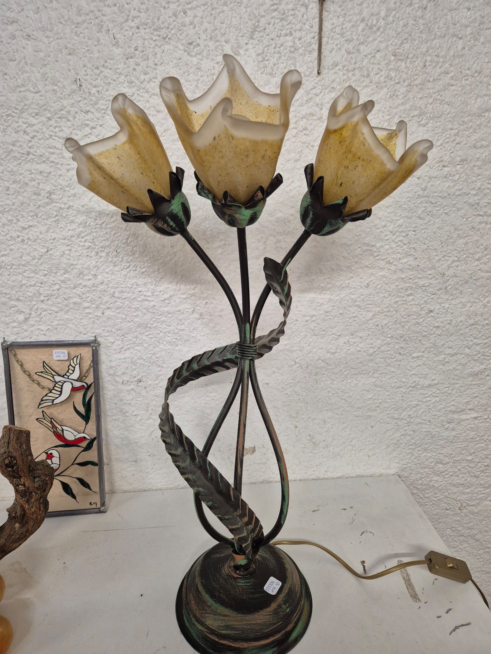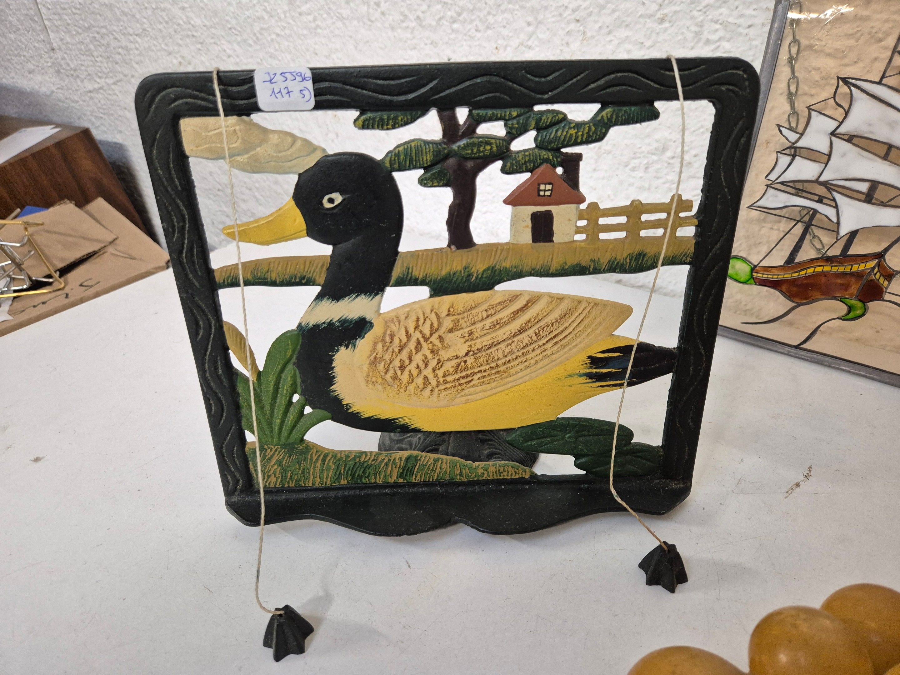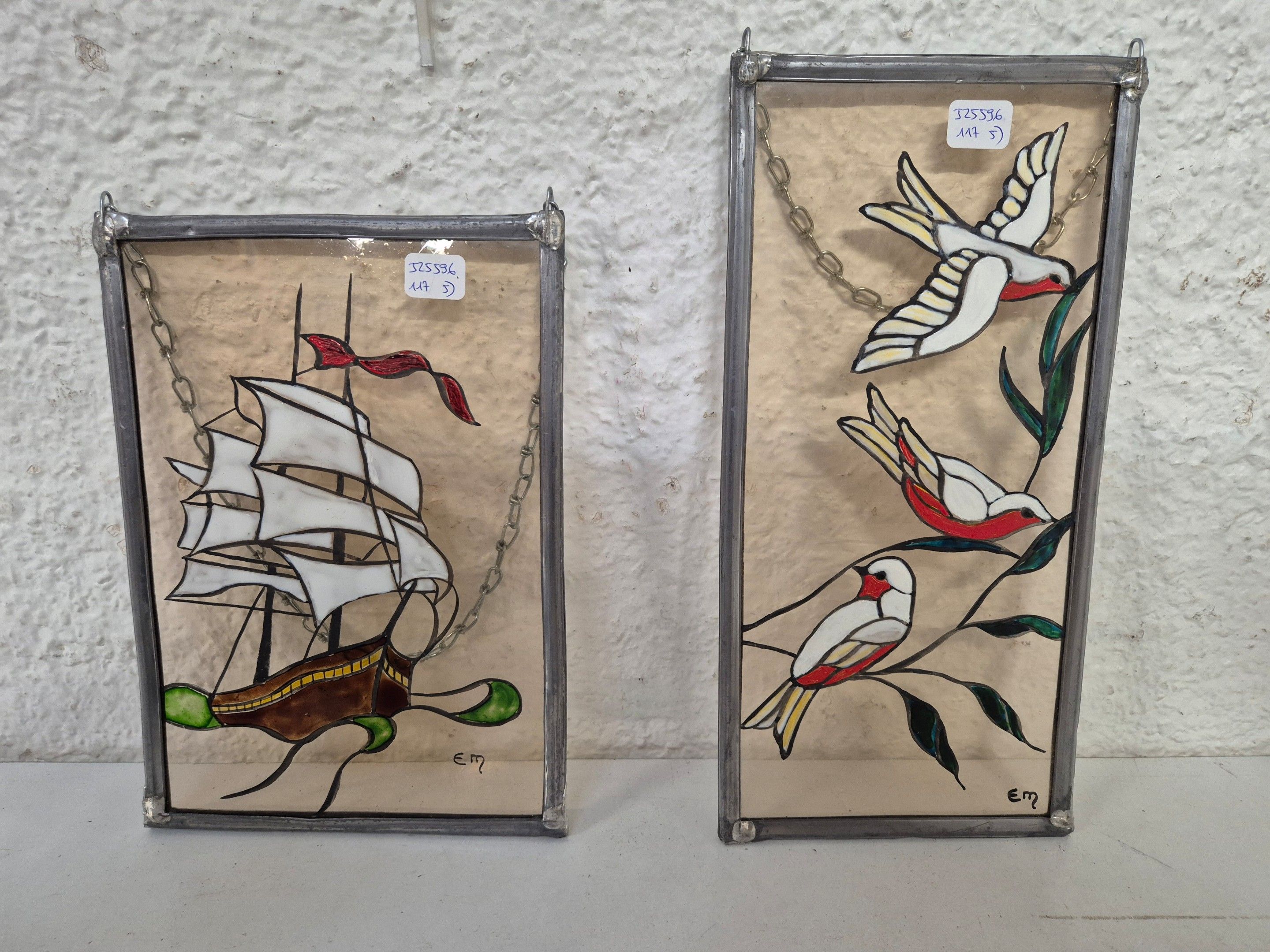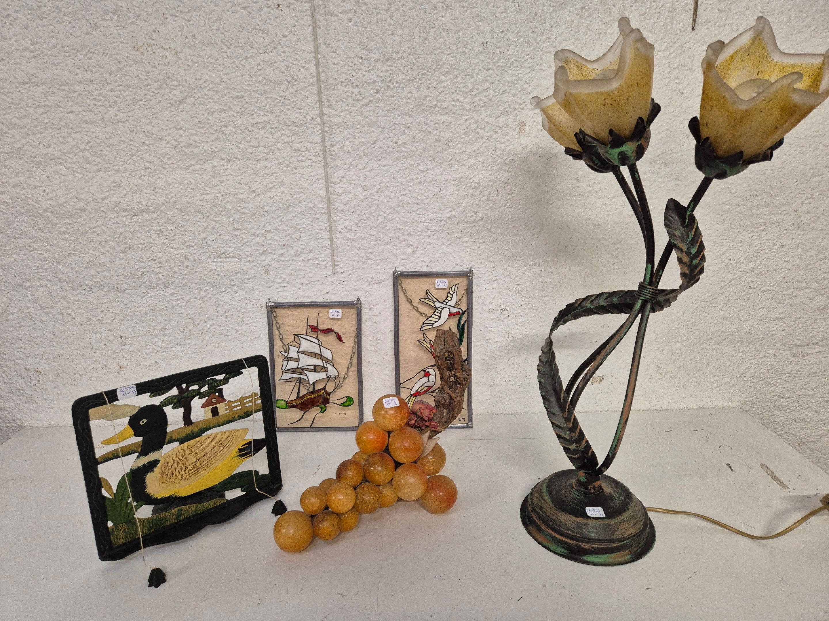 J/ Hard stone bunch of grapes and vine (25x30 cm), metal and frosted glass lamp featuring 3 flowers (H: 65 cm), 2 stained glass windows monogrammed E.M. featuring 3 birds and 1 boat (30x14 and 24x17 cm) and 1 painted metal lectern featuring a duck (24x25 cm).
