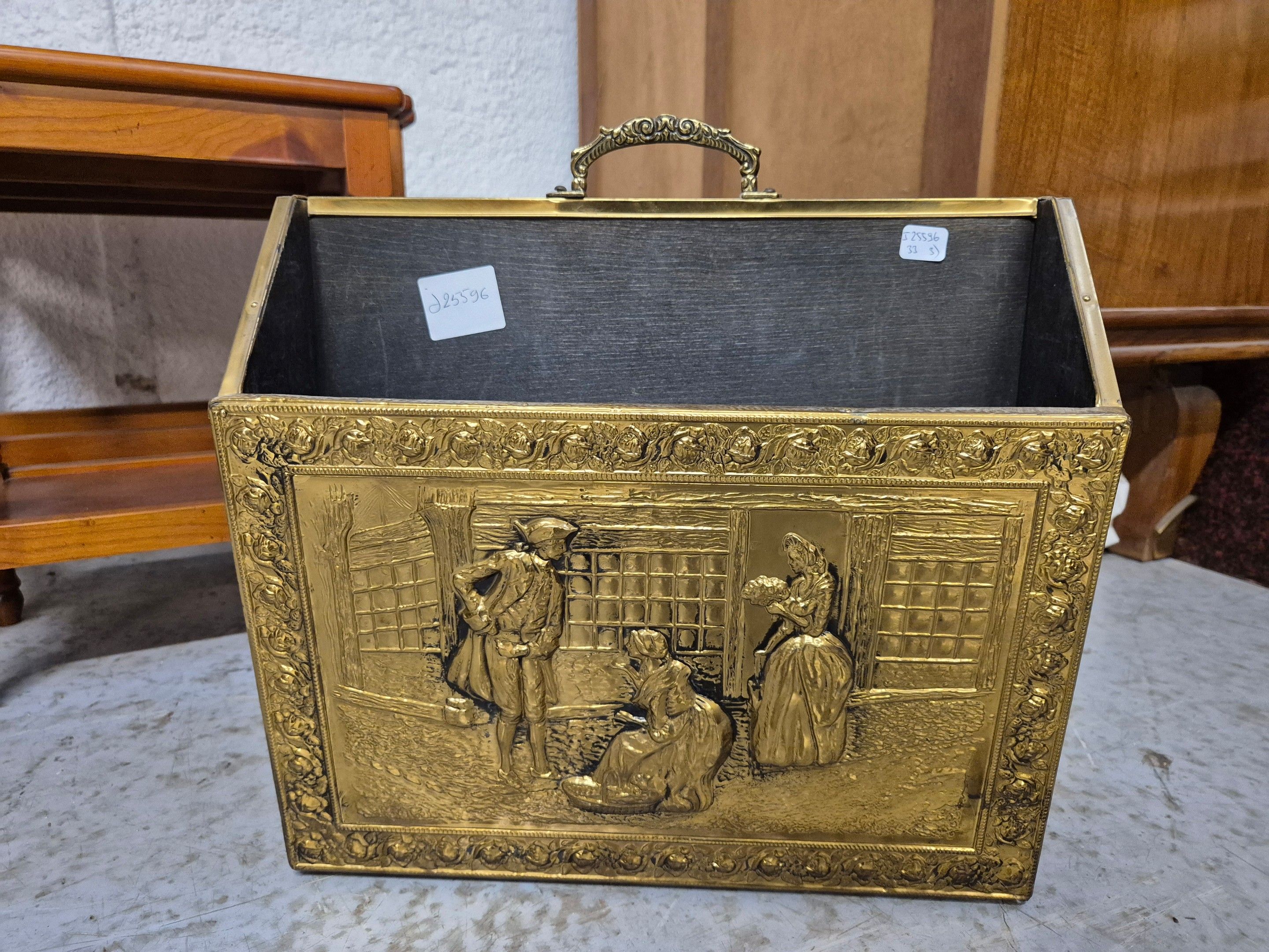 J/ Suite of 3 cherrywood nesting tables (50x53x38 cm), cherrywood coffee table with shutters (46x65x49 cm open) and embossed copper magazine rack decorated with a gallant scene.