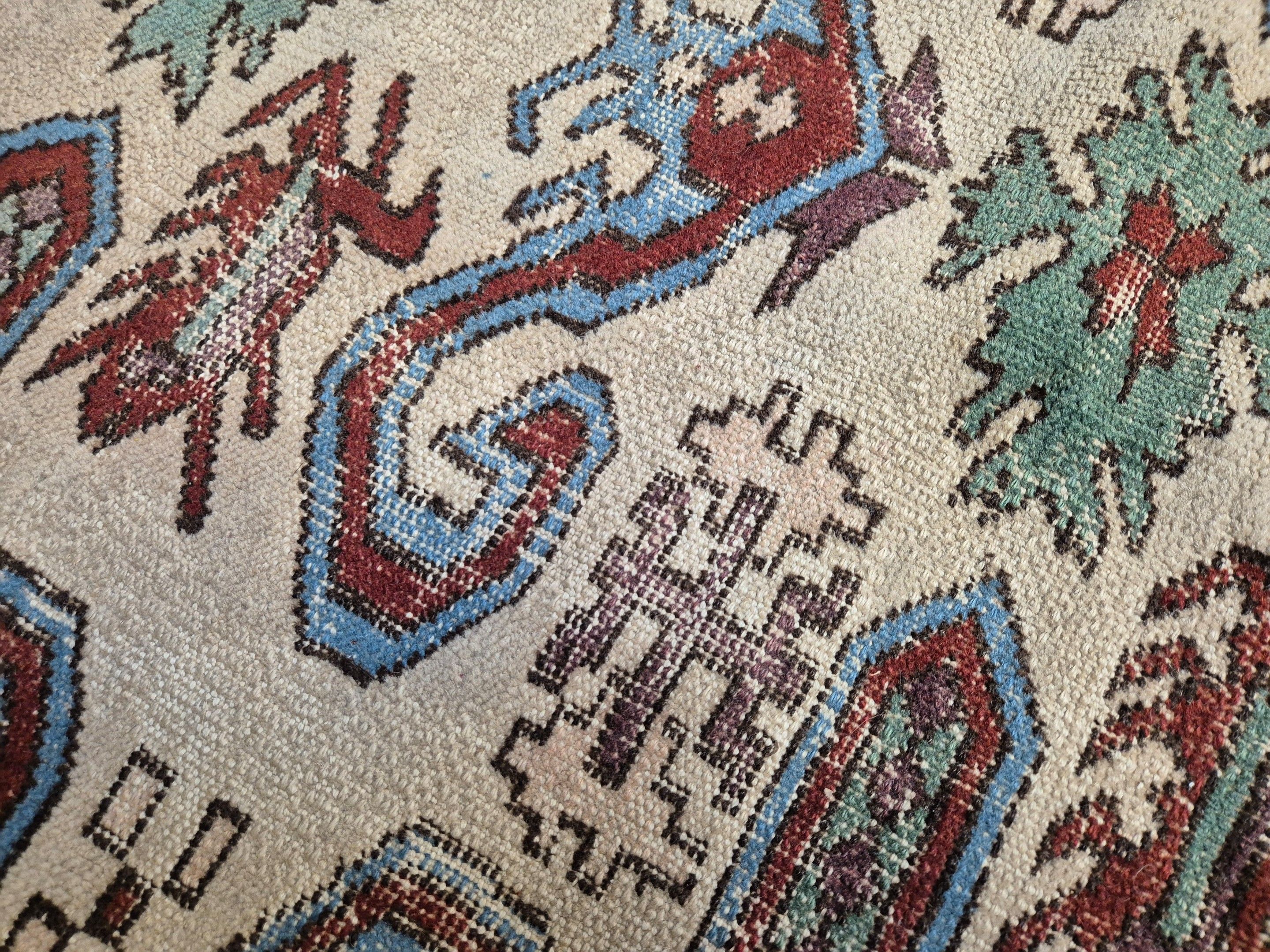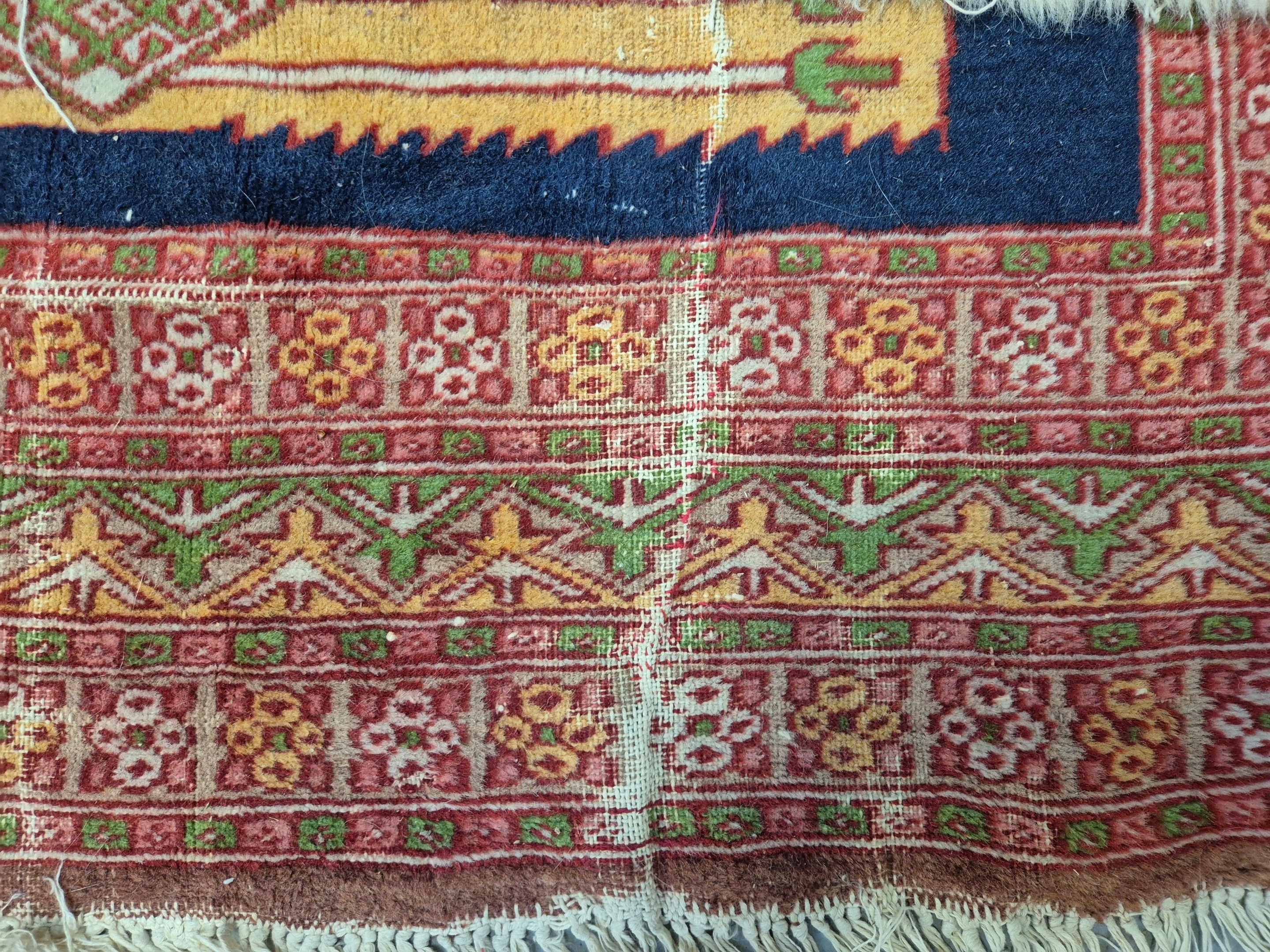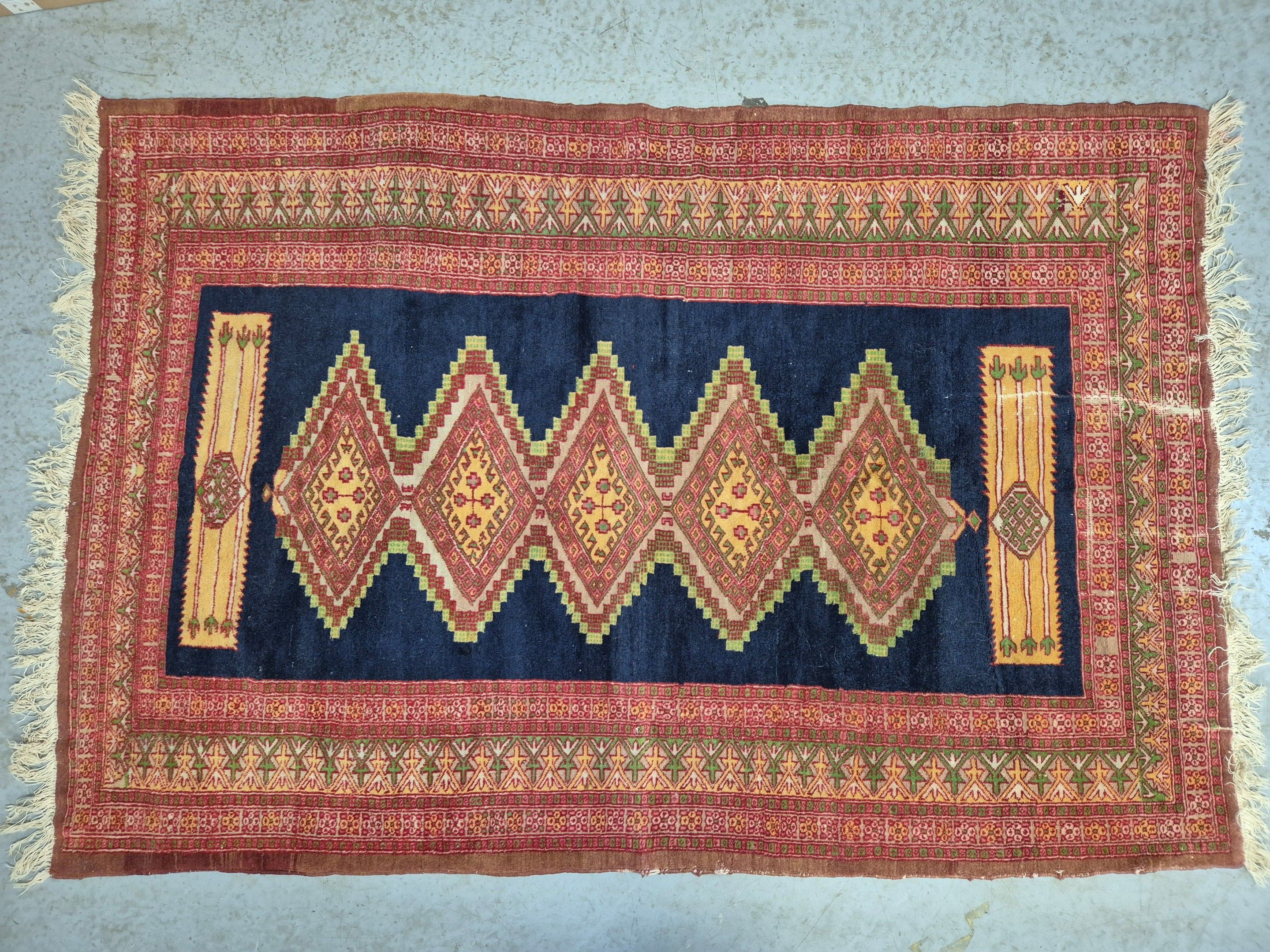 J/ 3 Oriental style woollen carpets including 1 carpet with 5 boxes on a blue background and pink border (180x120 cm), 1 carpet with red stylised bird motifs on a white background and blue border (170x110 cm) and 1 carpet with elephant foot motifs on a coral background (130x88 cm).
