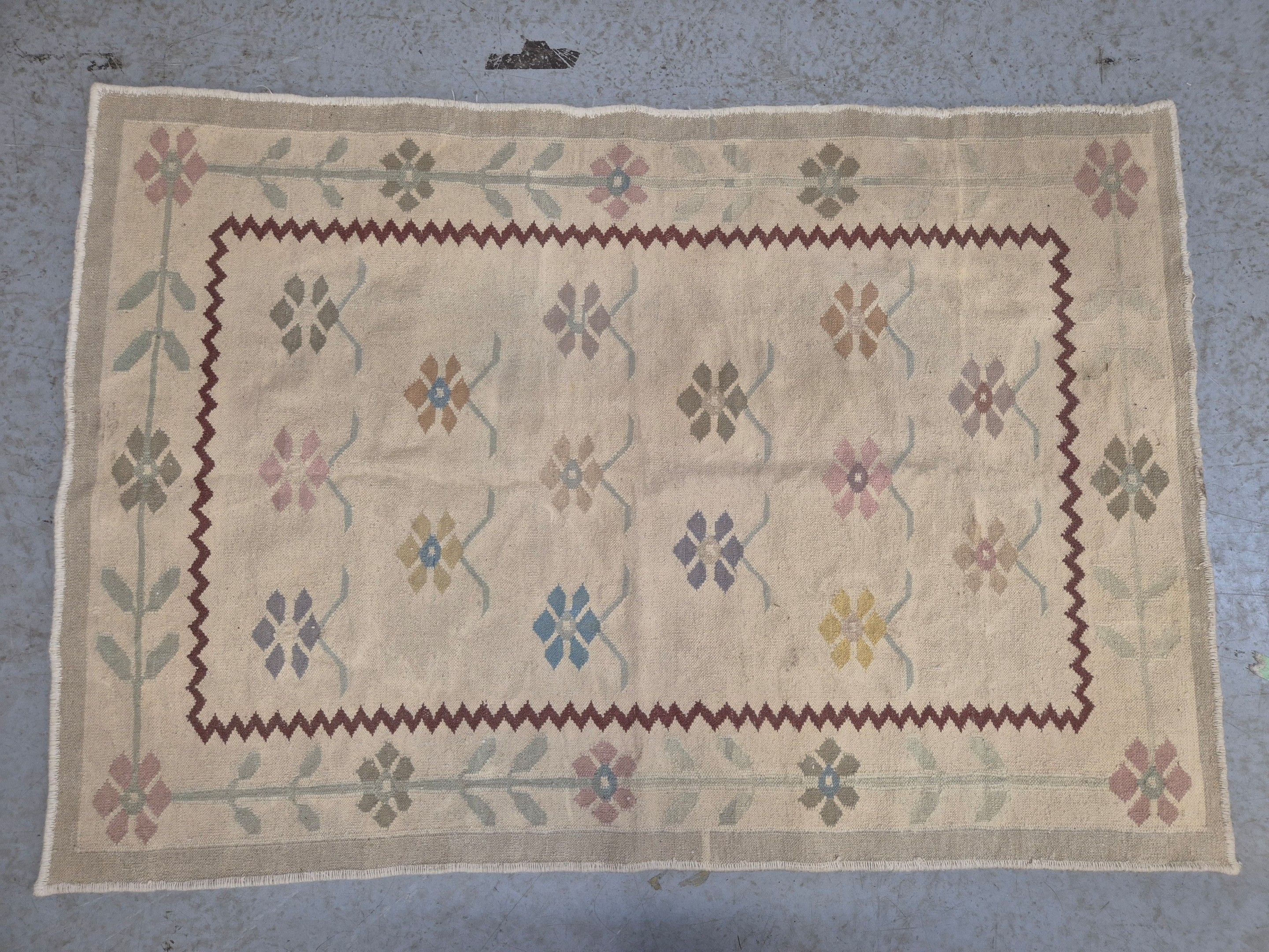 J/ Kilim style wool carpet decorated with flowers on a beige background.