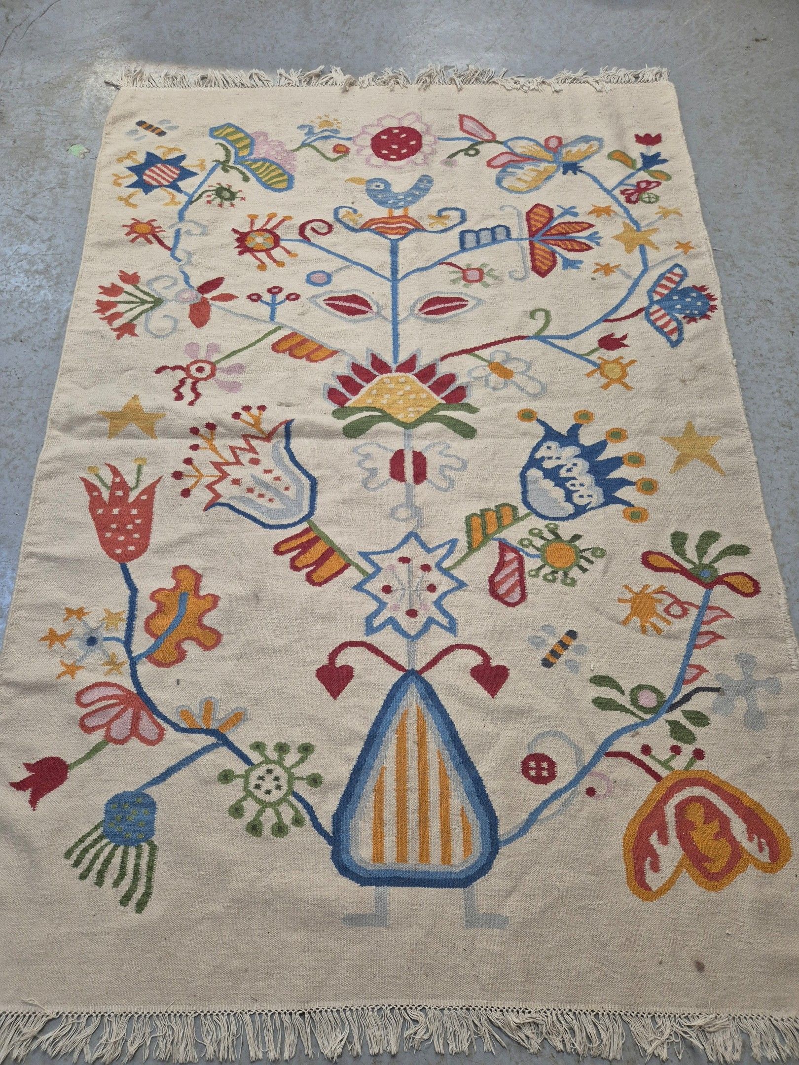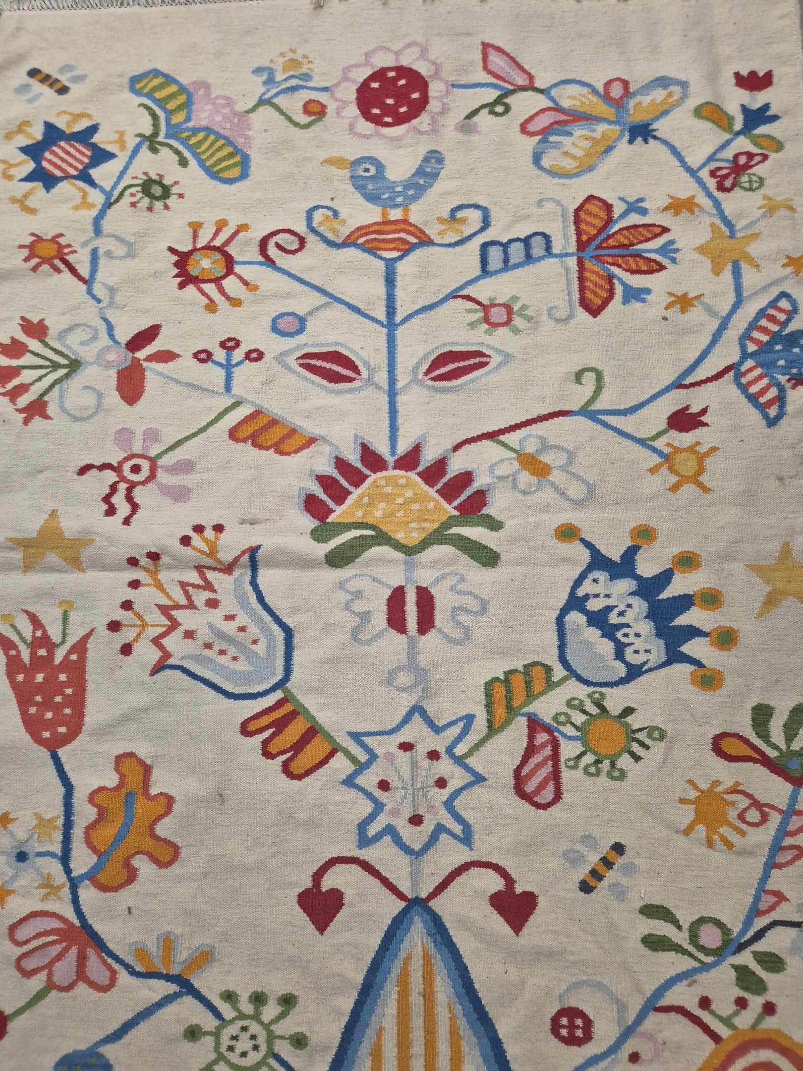 J/ Kilim style wool carpet decorated with flowers and birds on a white background.