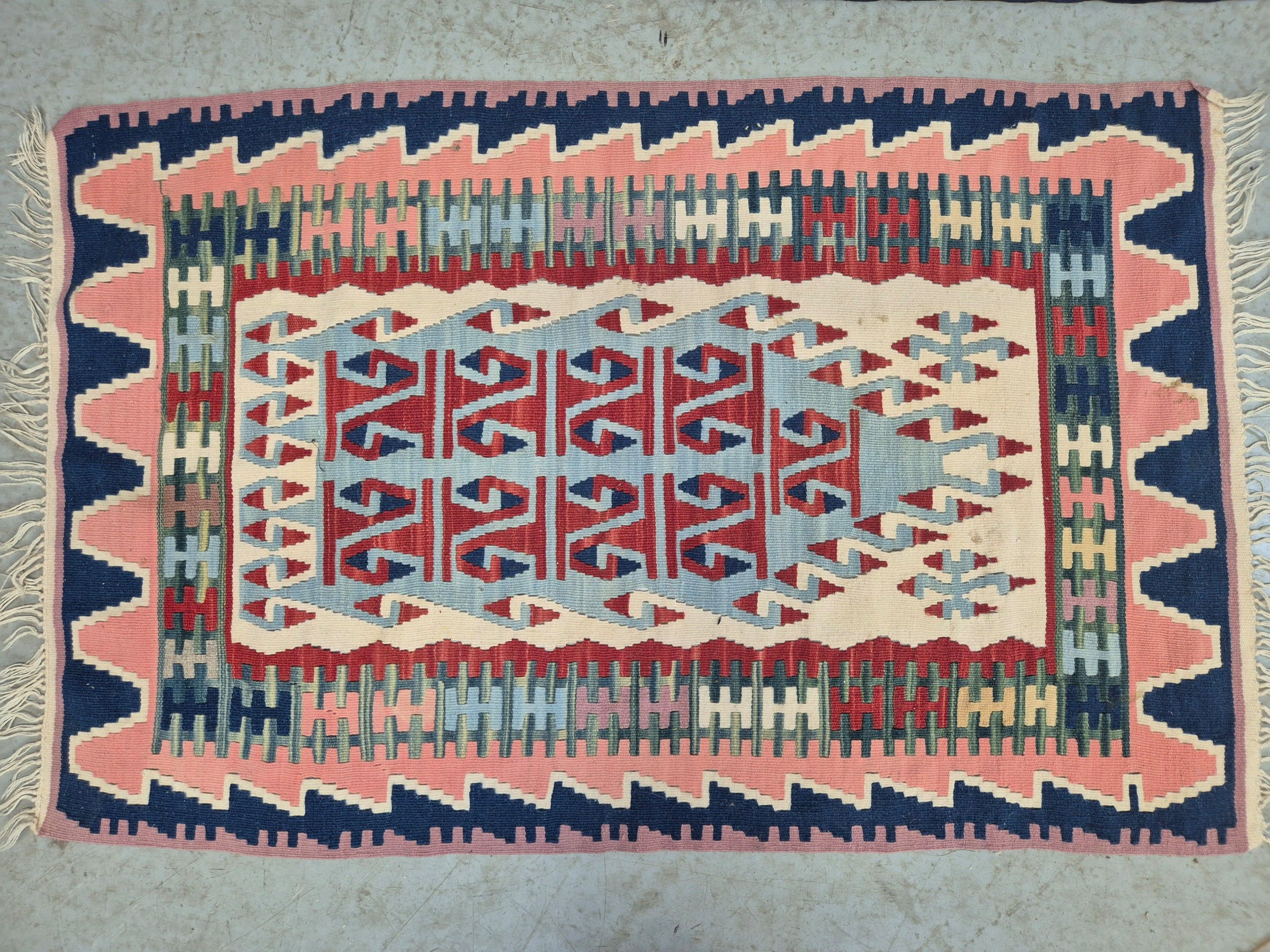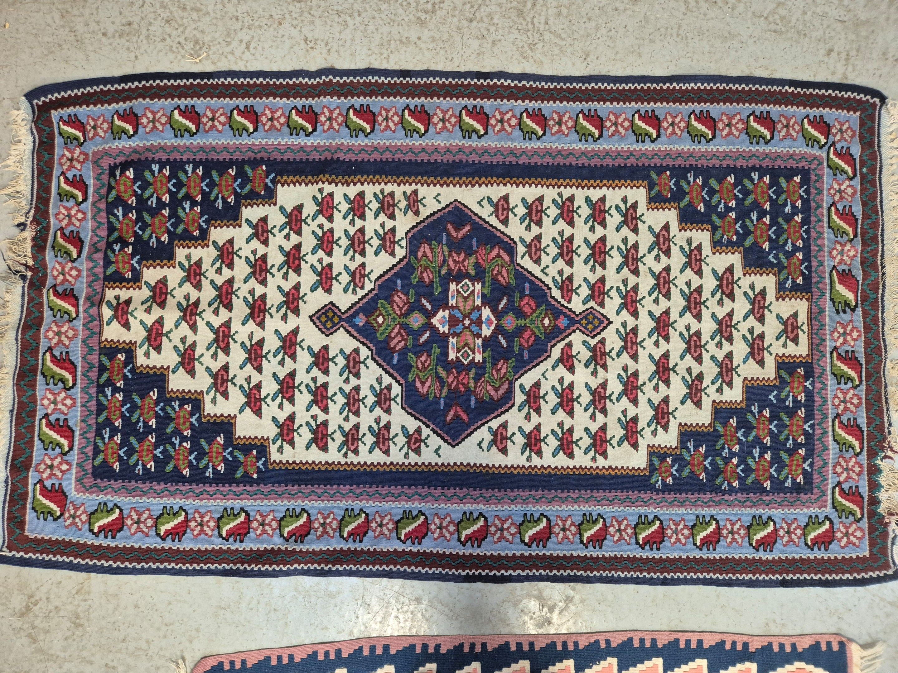 J/ Set of 2 Kilim style woollen rugs with stylised geometric…