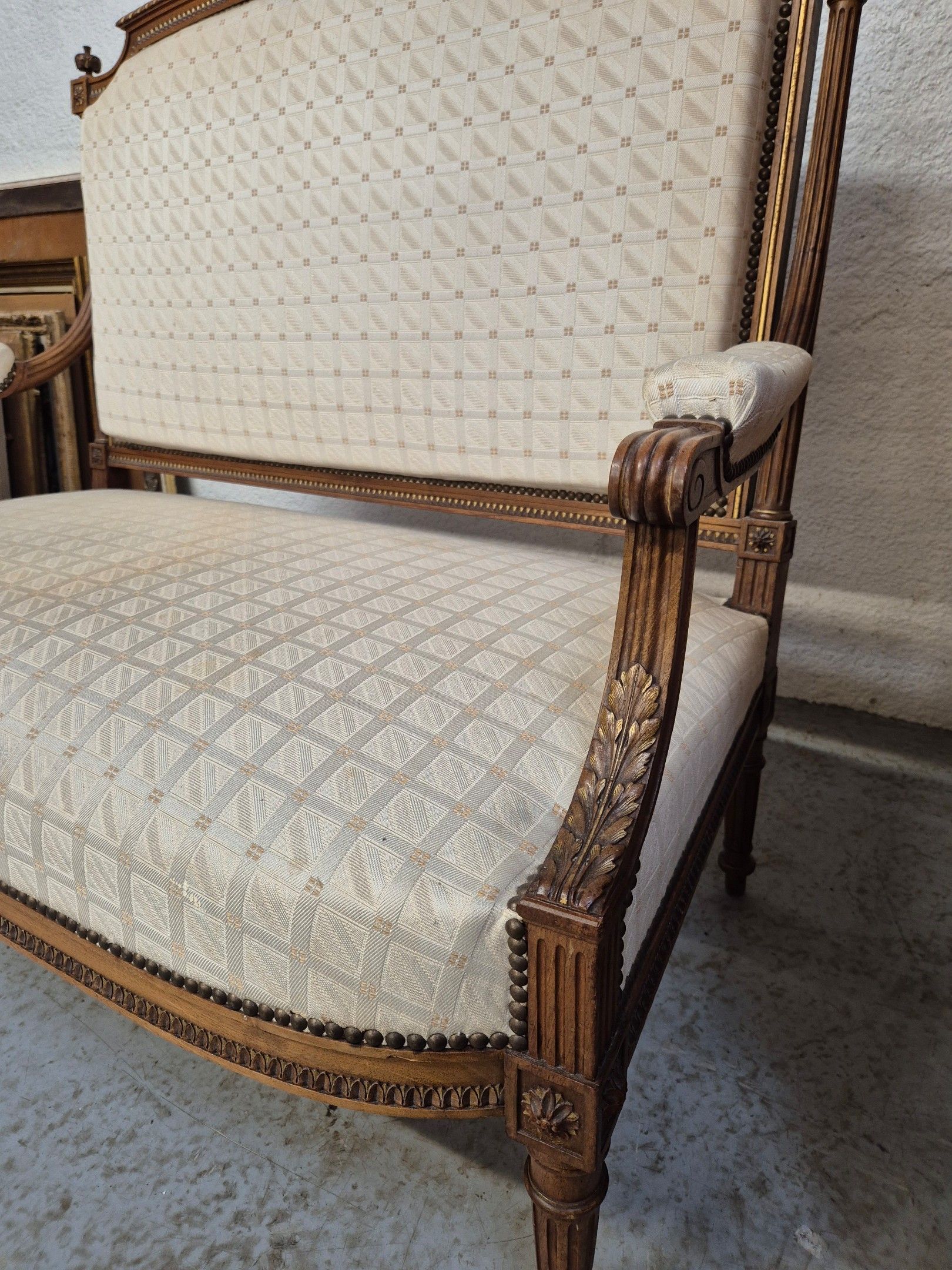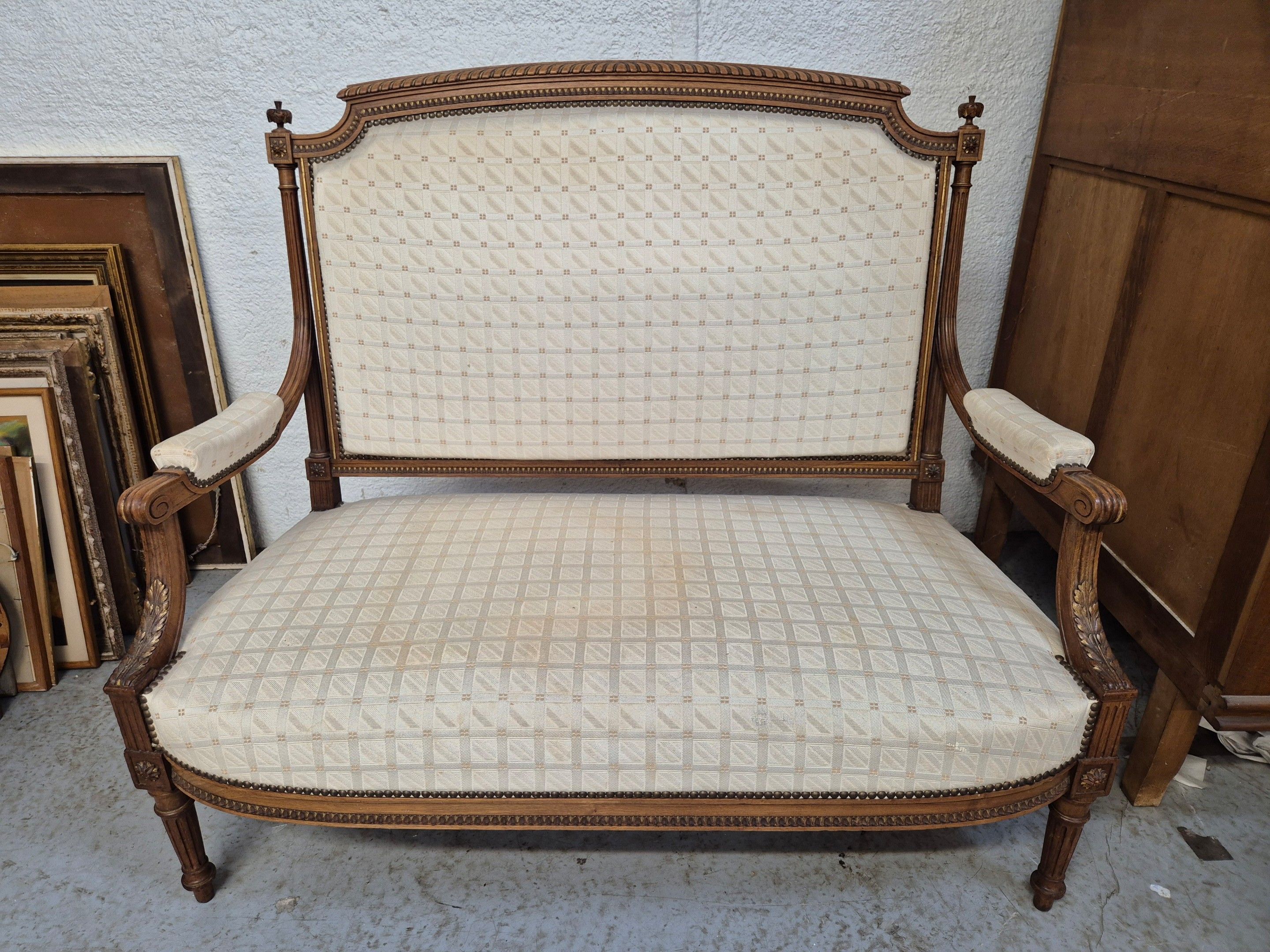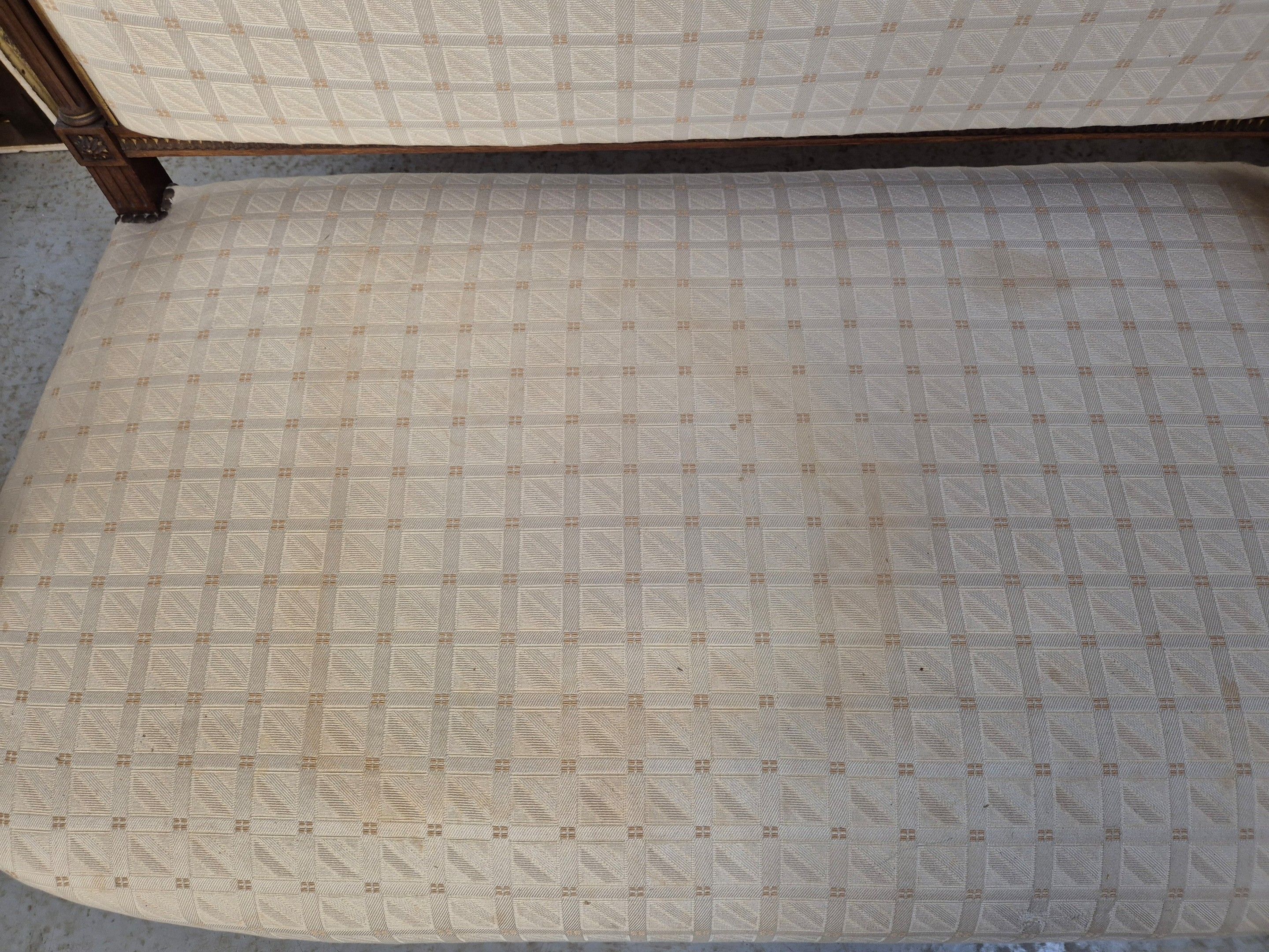 J/ Louis XVI style bench seat upholstered in beige checked f…
