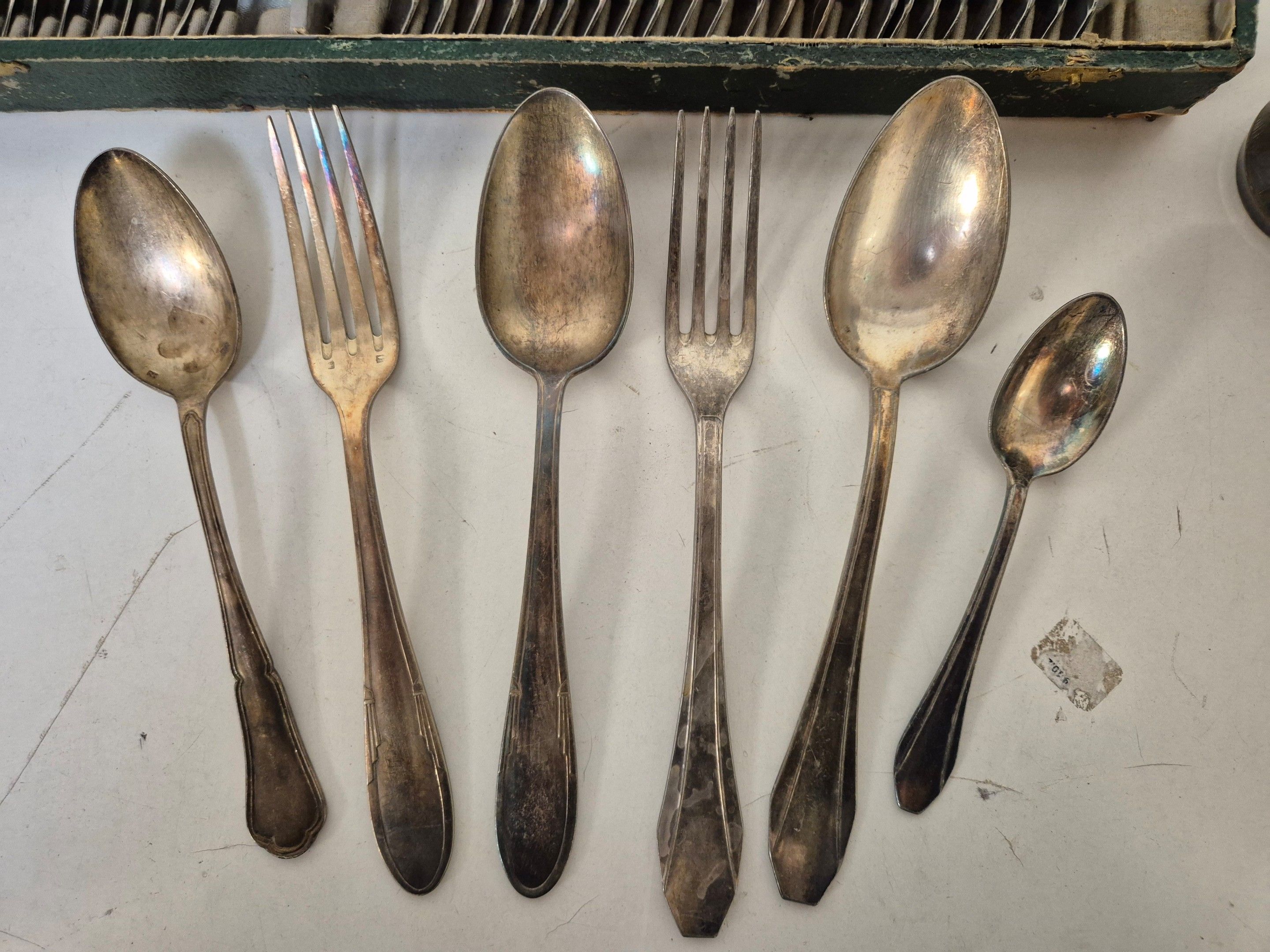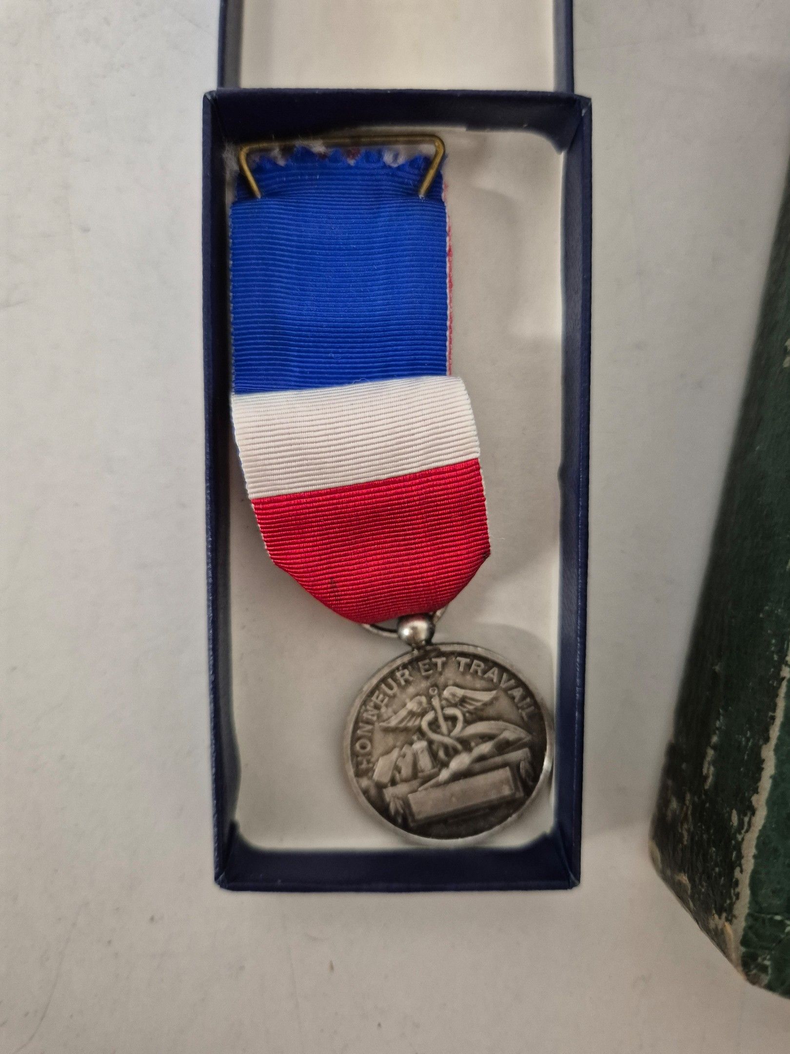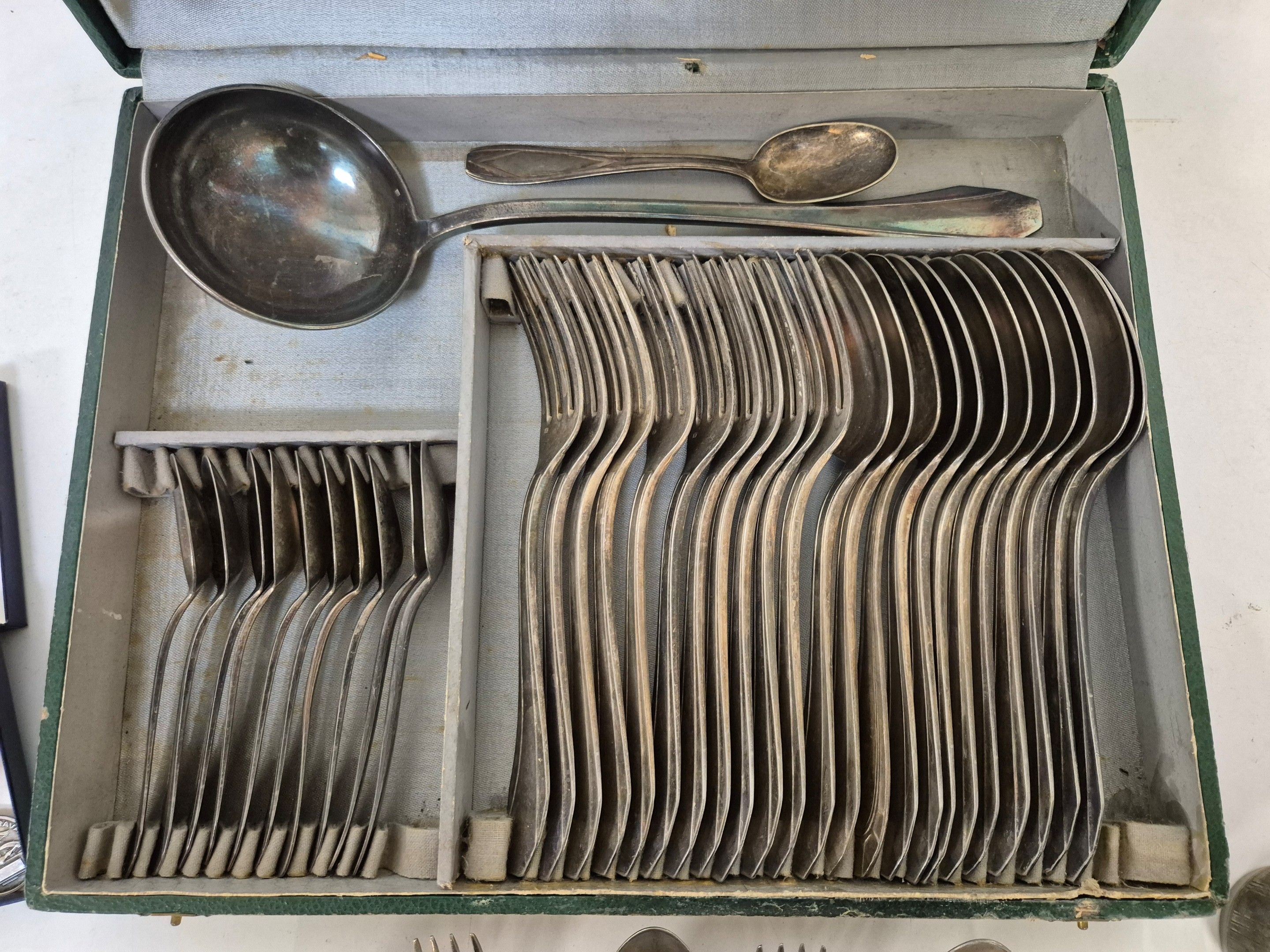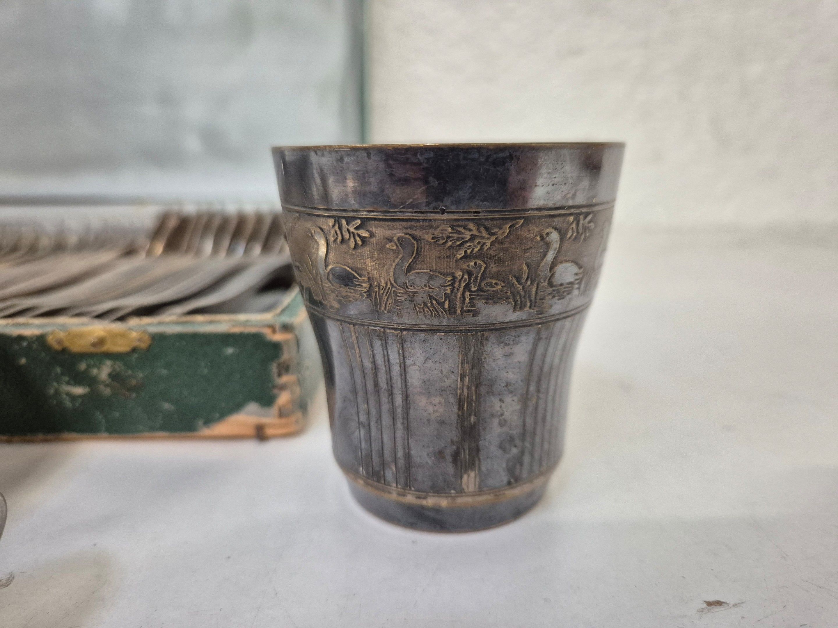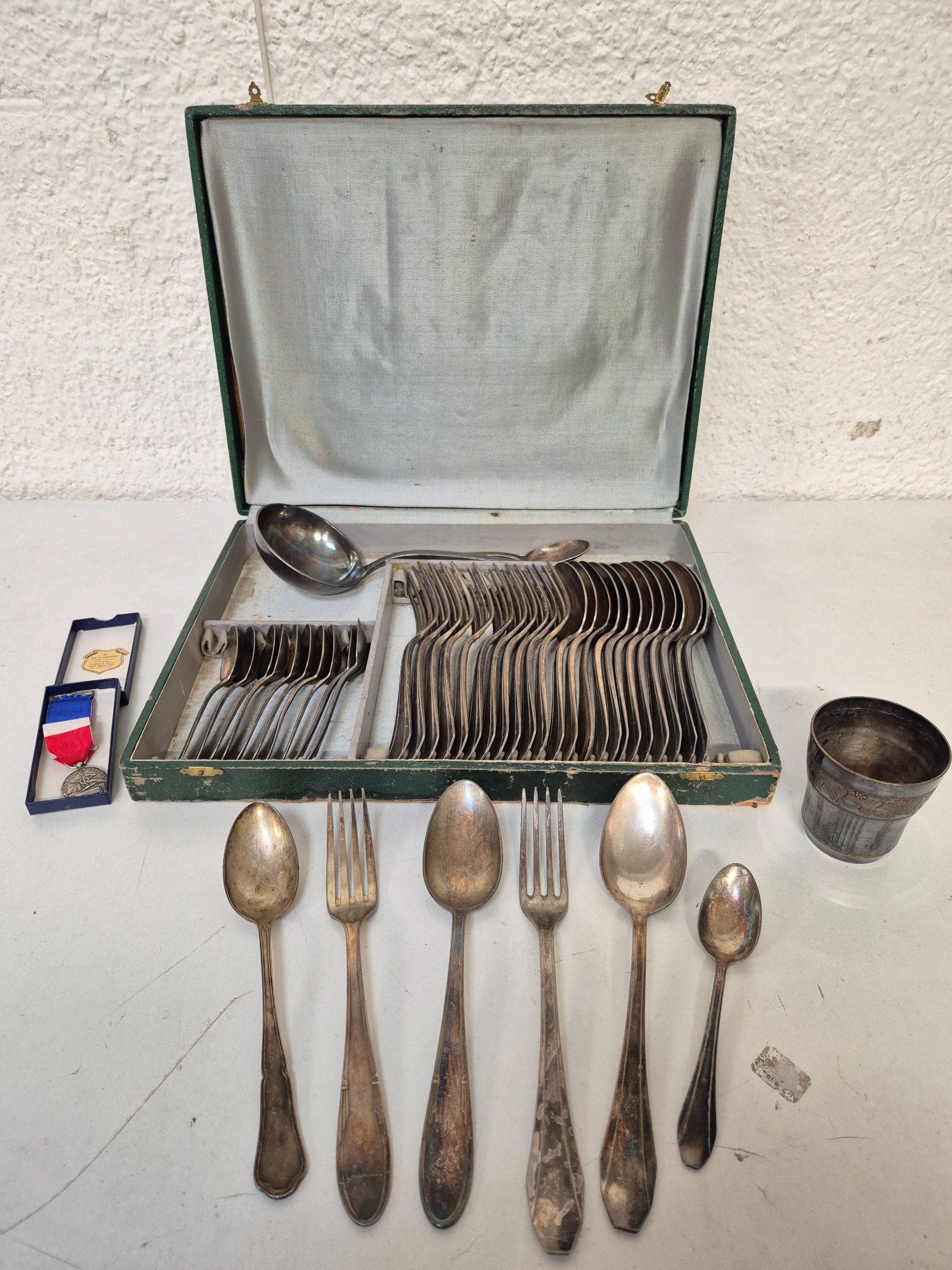J/ Matching silver-plated household set. A tumbler and 1 Honneur et travail medal are attached.