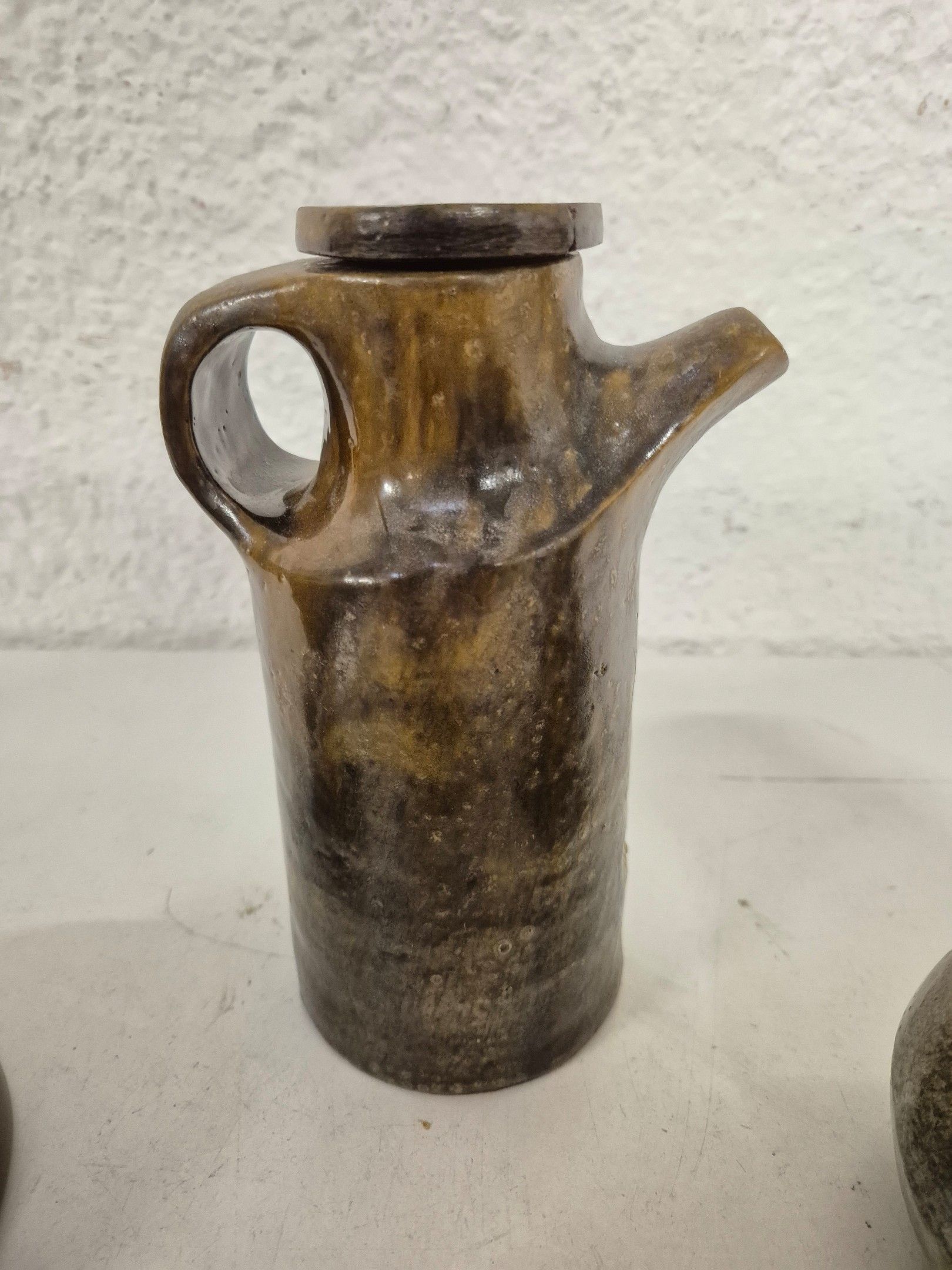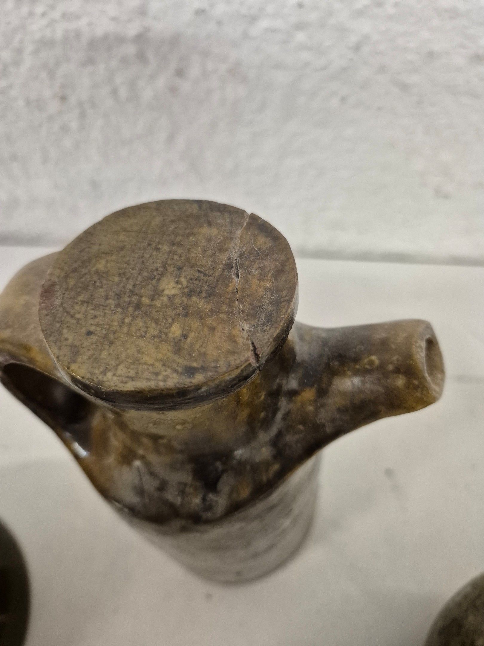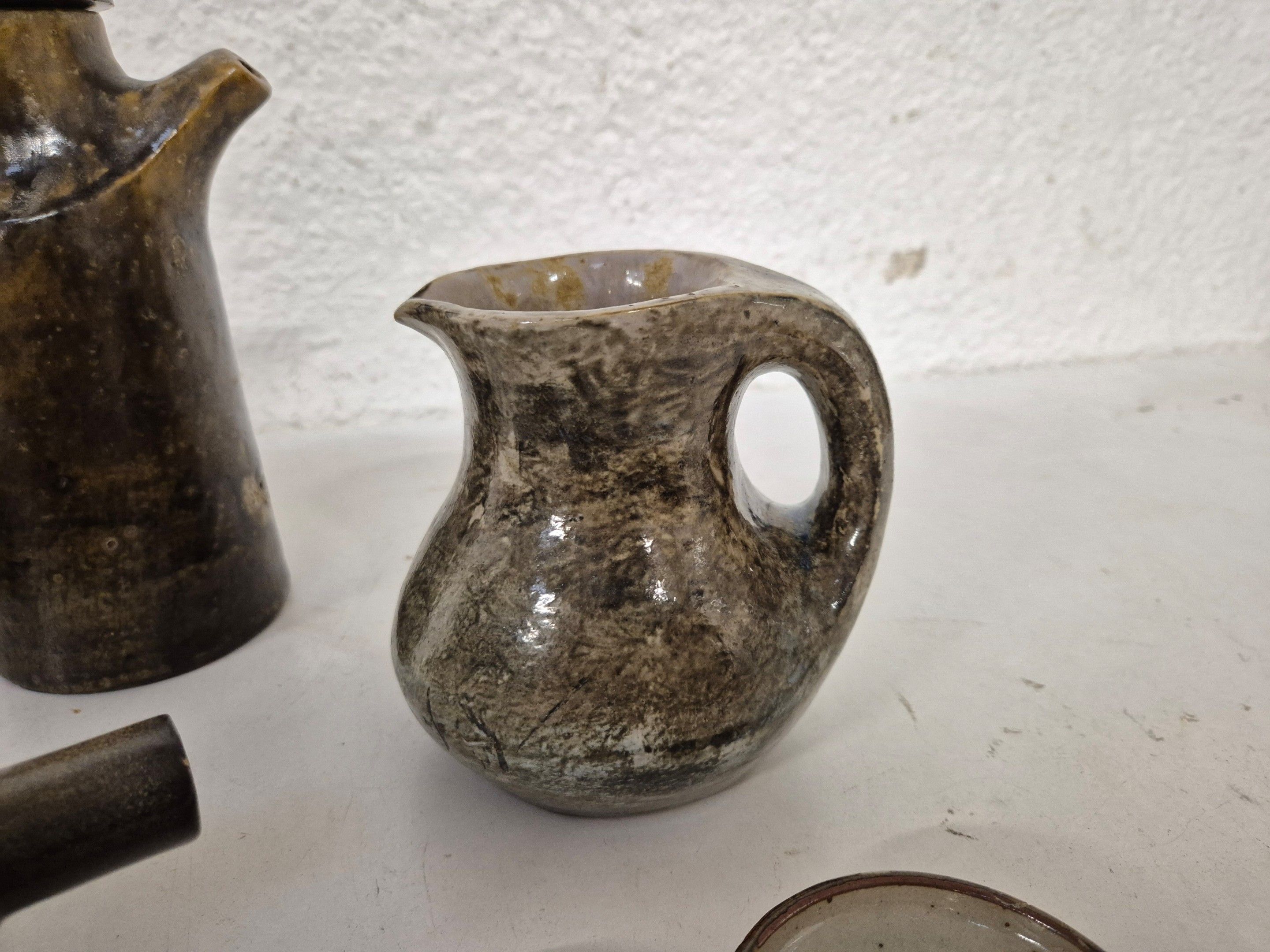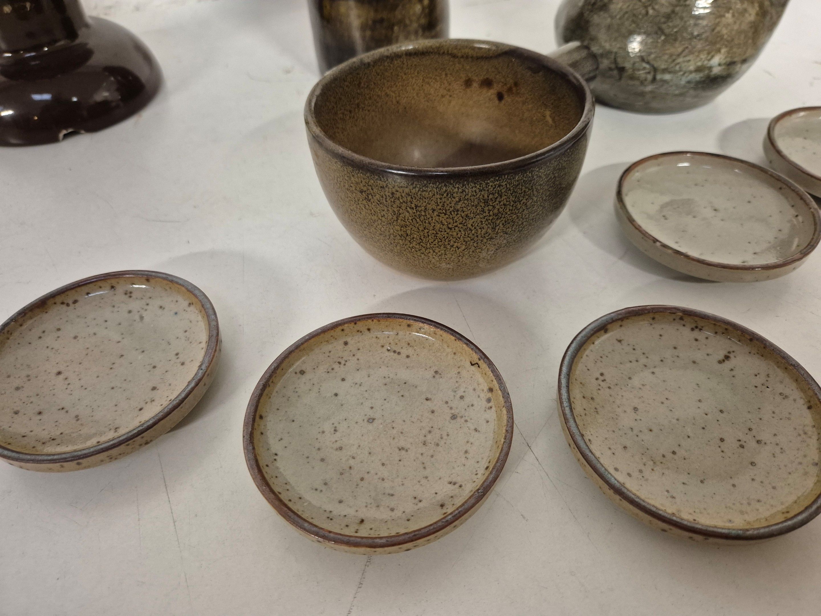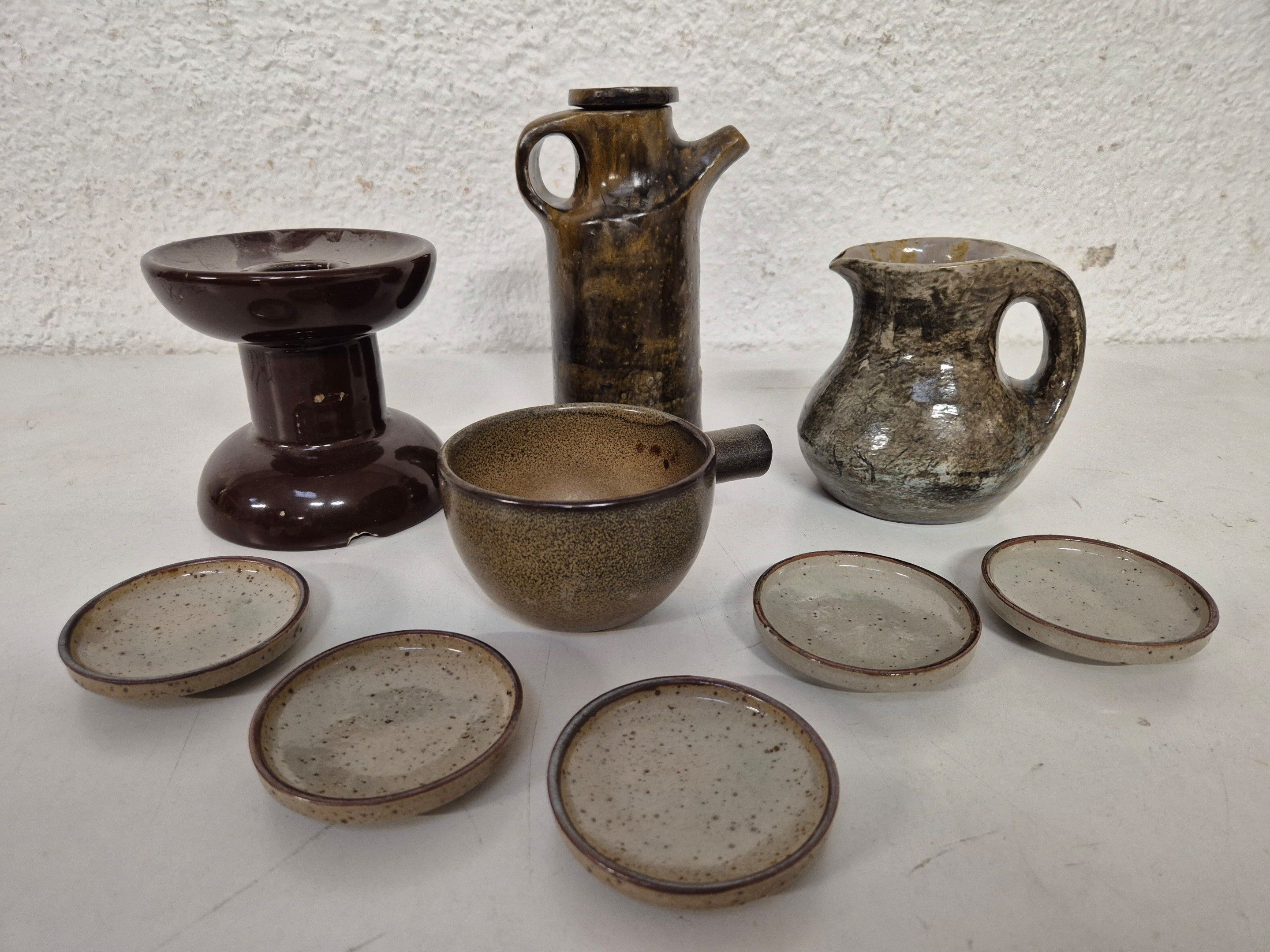 J/ Brown ceramic pitcher, jug, pot, base and 5 bowls.