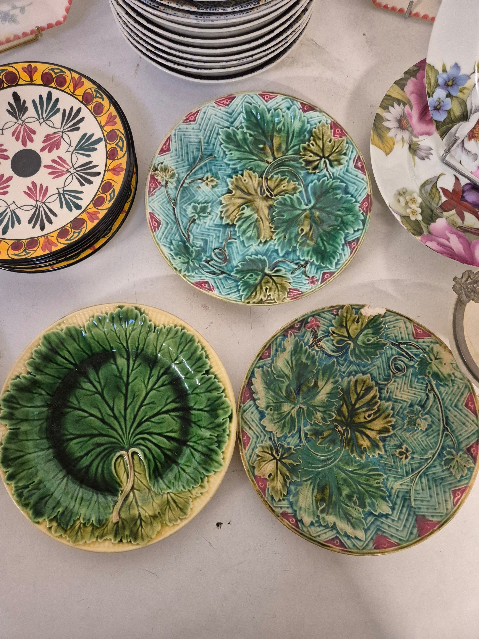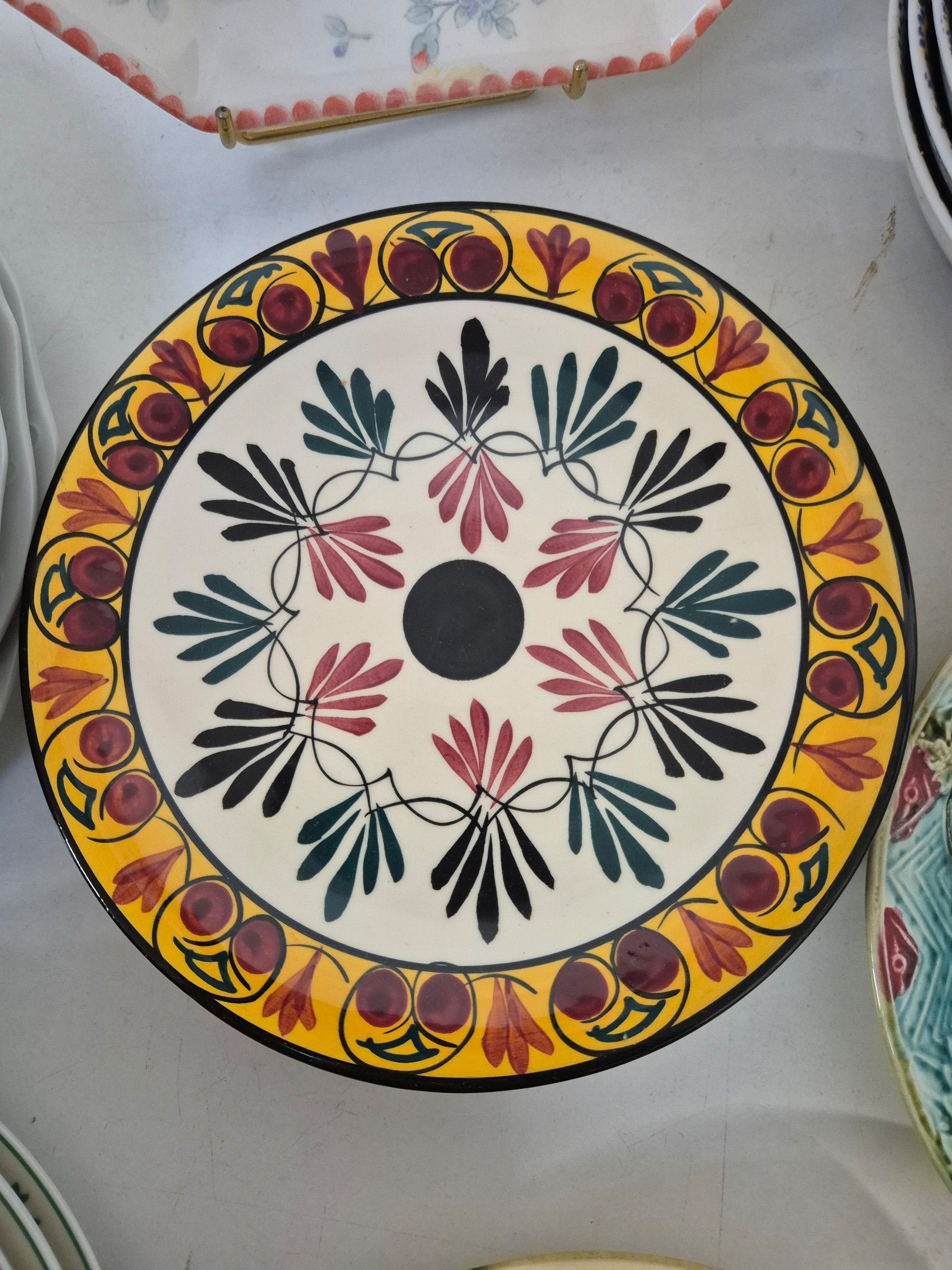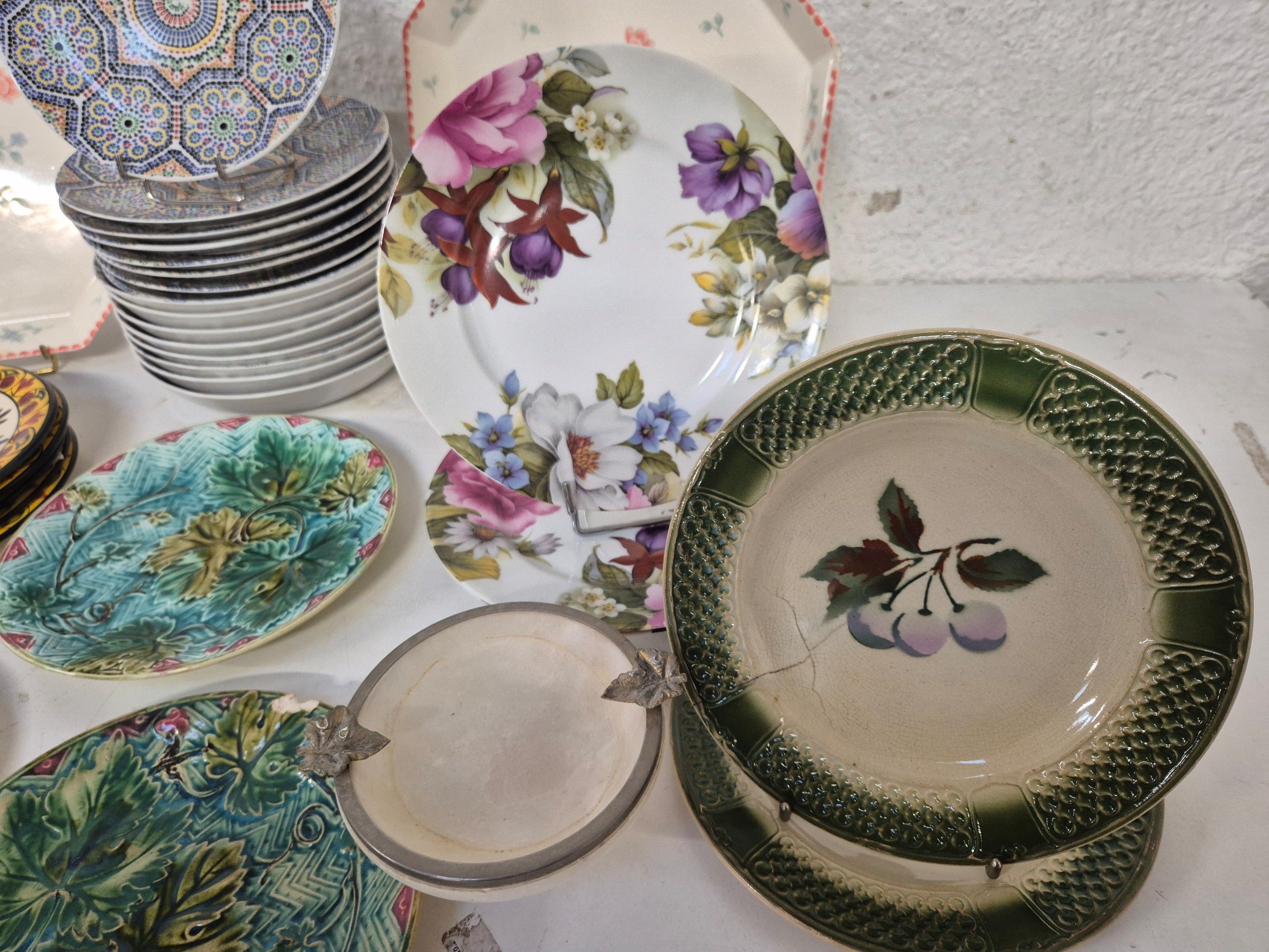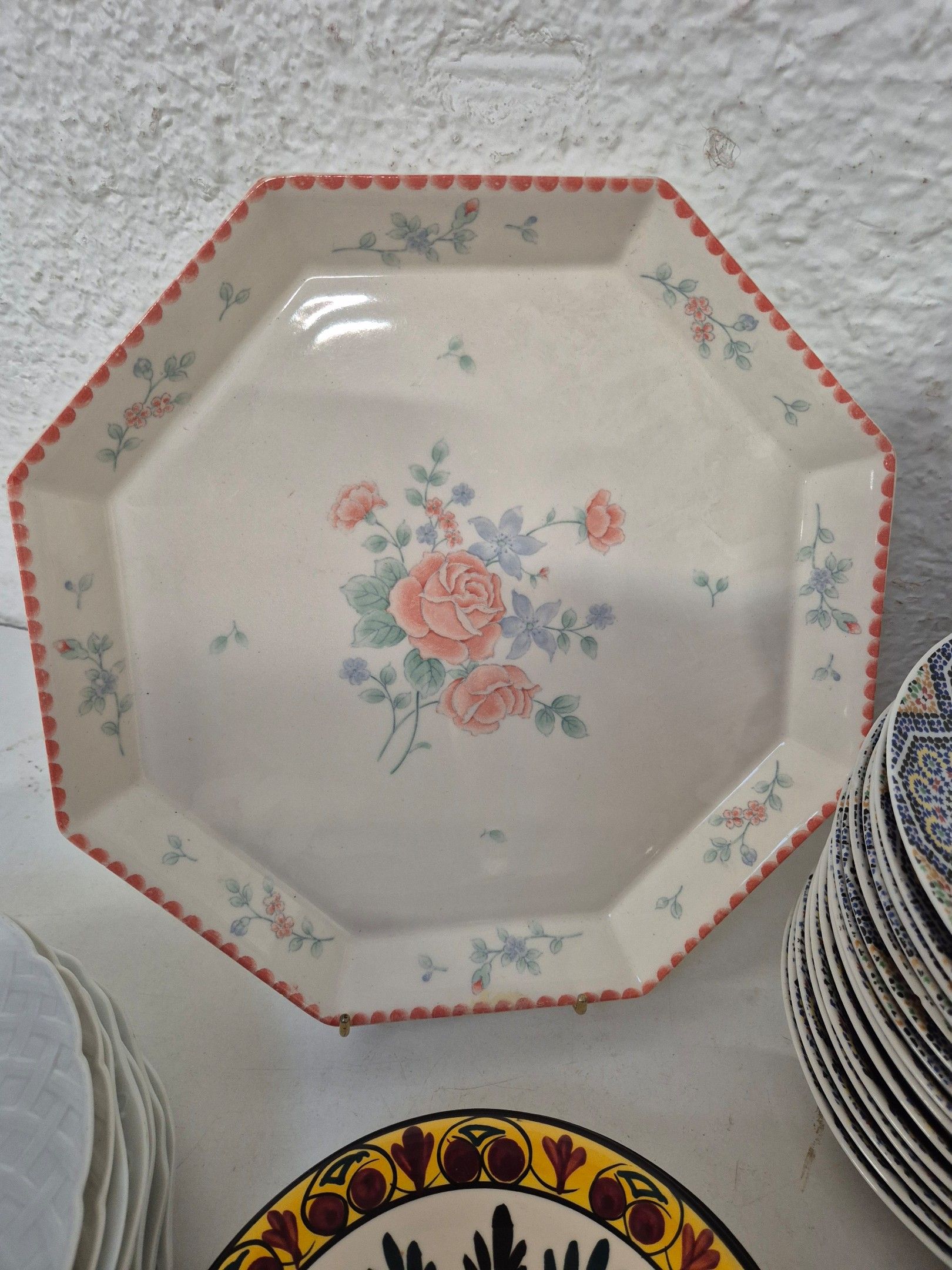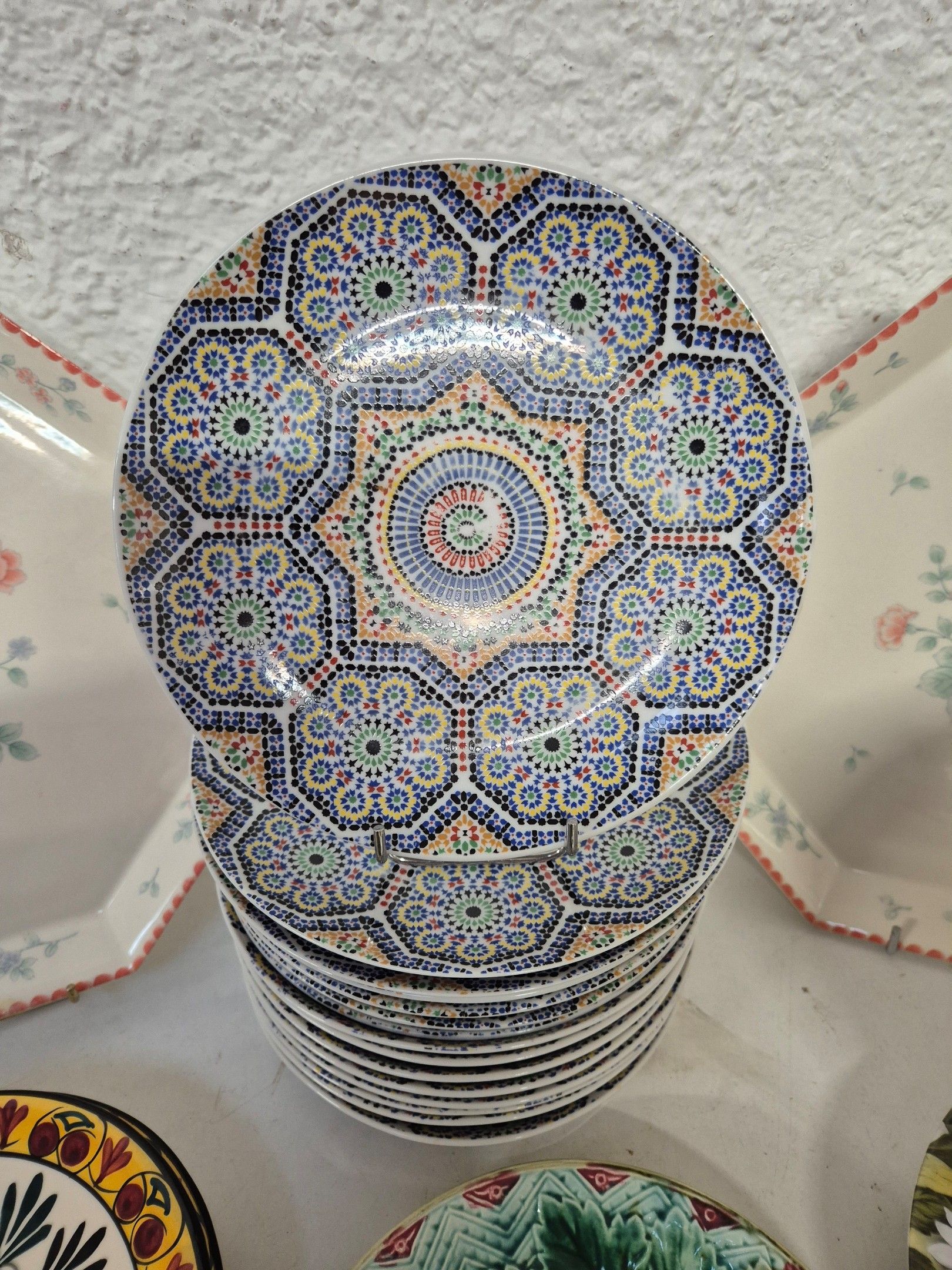 J/ Lot of mismatched crockery including plates with oriental motifs, 4 Haviland cups, 8 white plates, 3 plates with floral motifs, 5 plates in barbotine, 2 hexagonal dishes with rose decoration and miscellaneous.