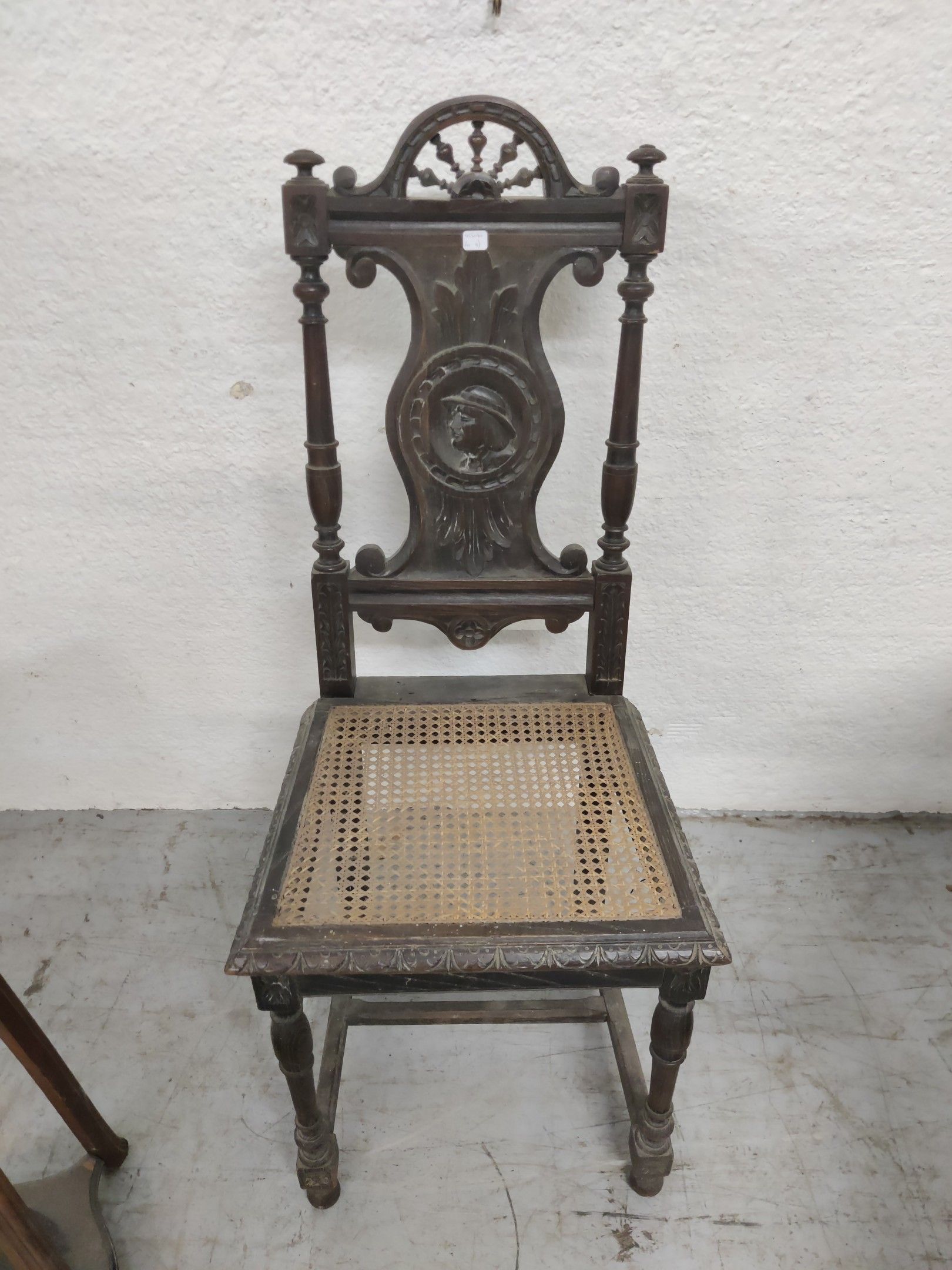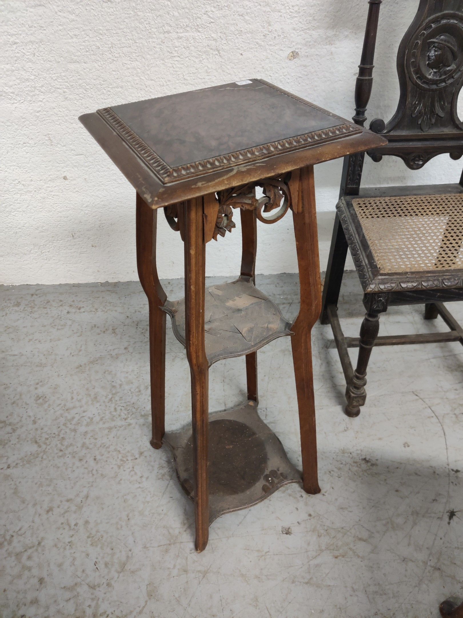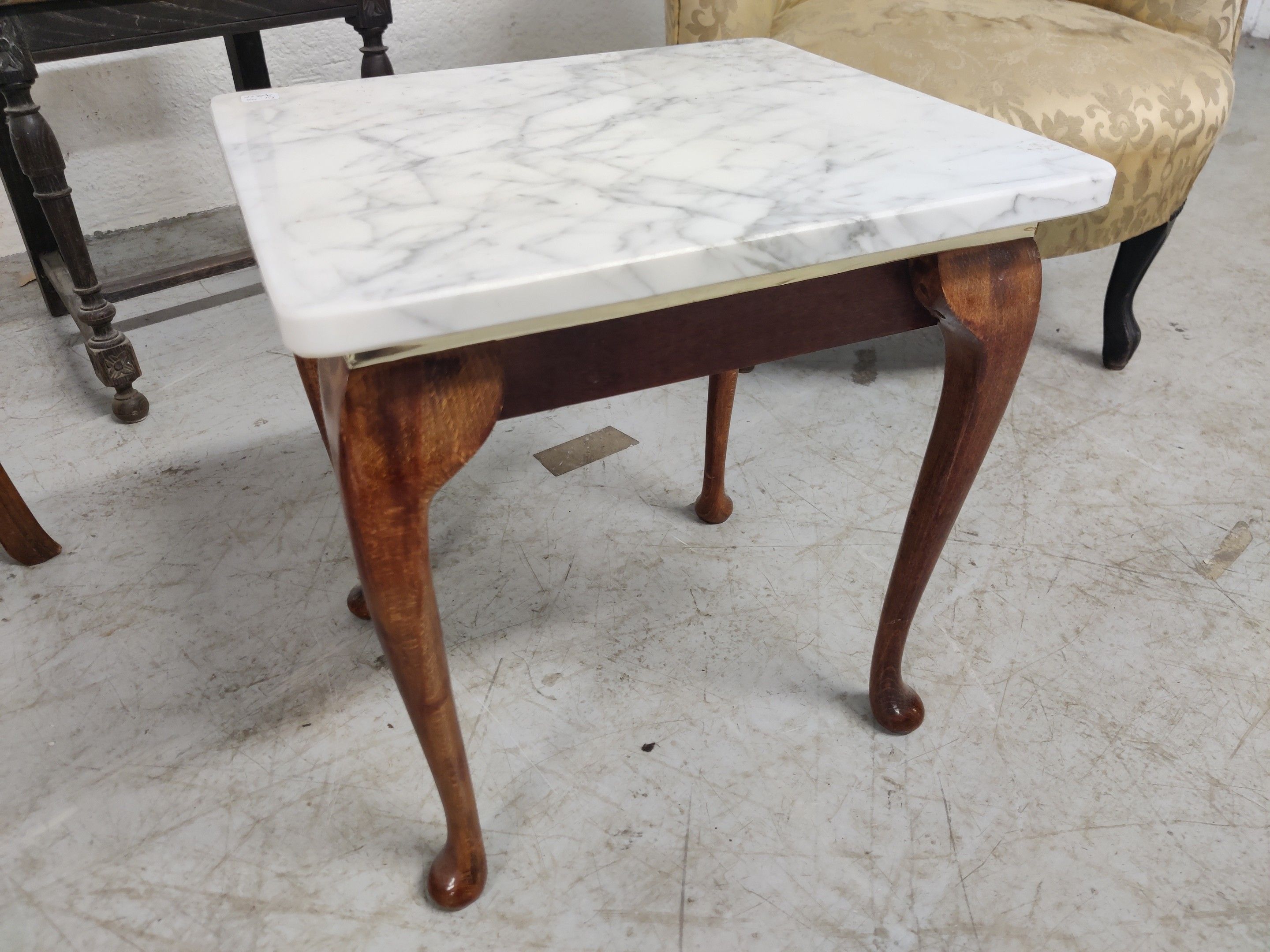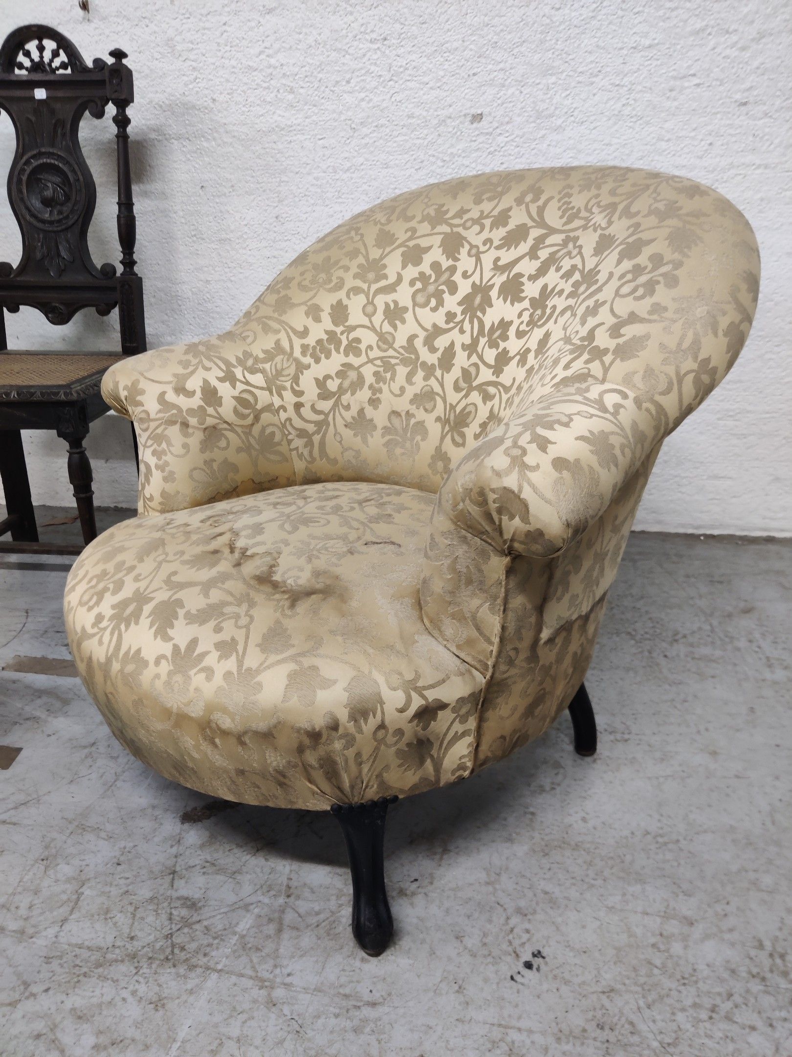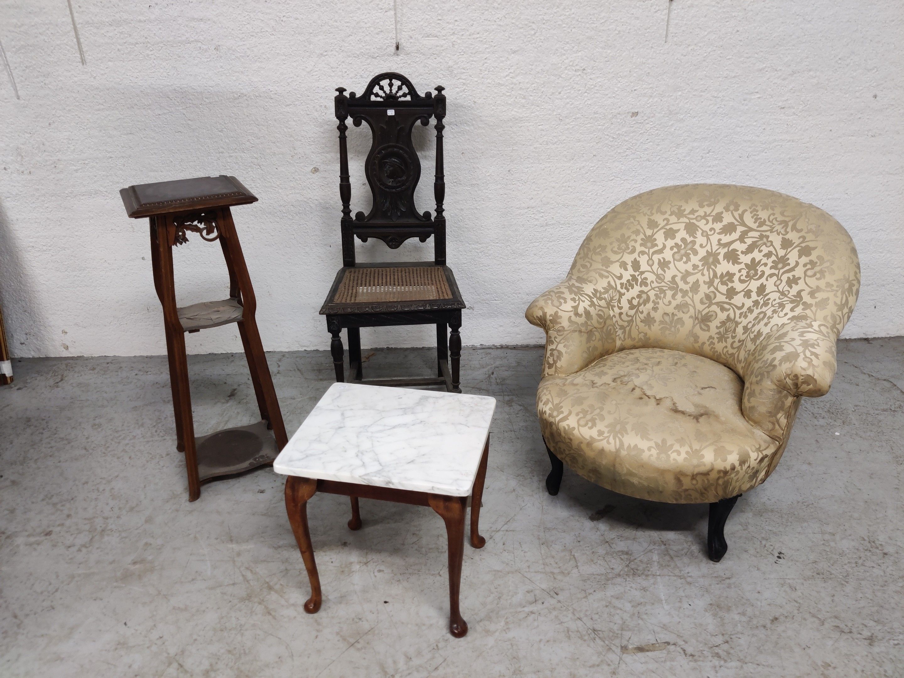 Napoleon III style caned armchair (mottling), Henri II style caned chair, Art Deco style selette and English style sofa with white marble top.