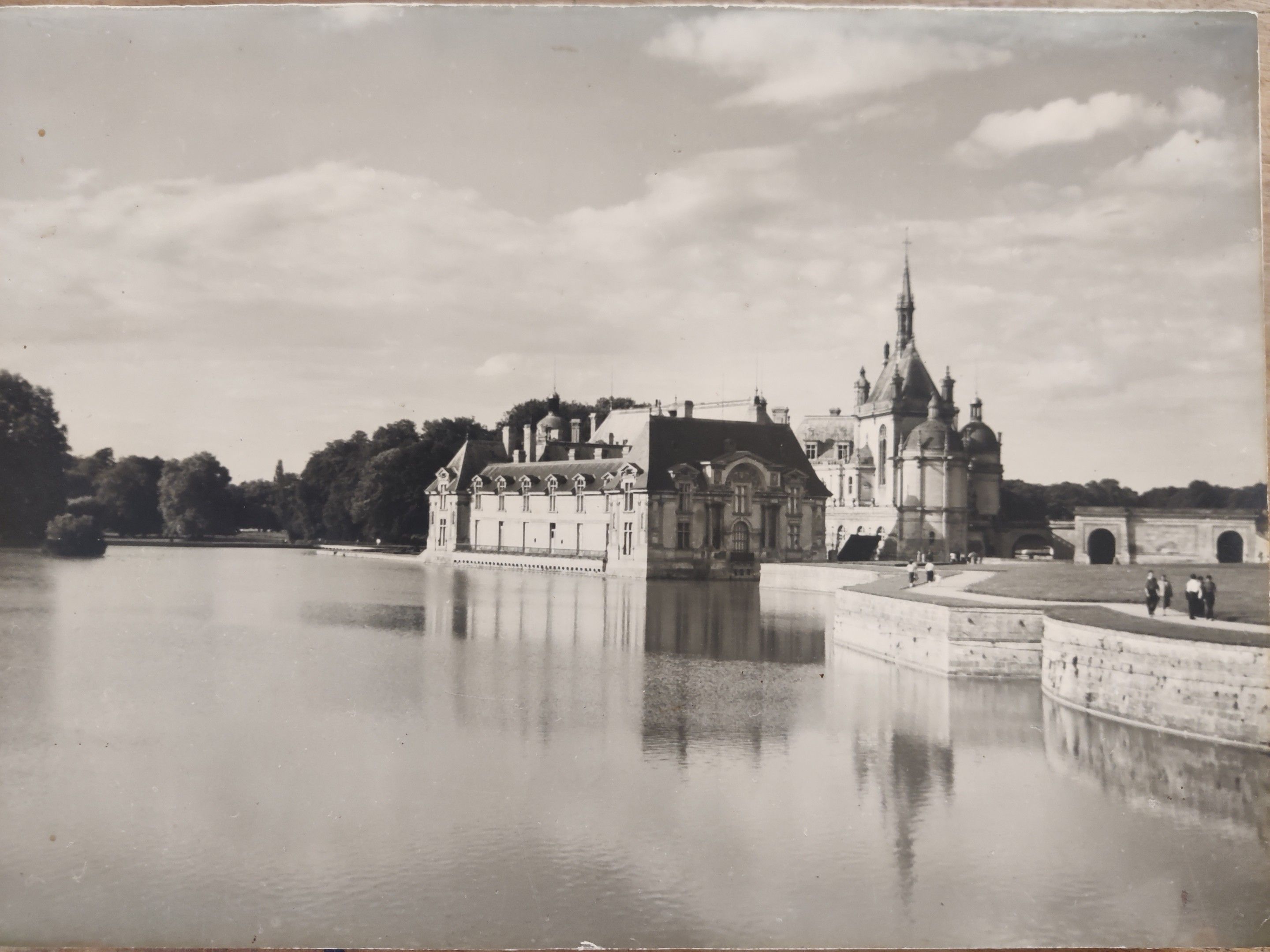Gilded plastic mirror, 91x51 cm and 1 photographic reproduction of the Château de Chantilly 29x40 cm