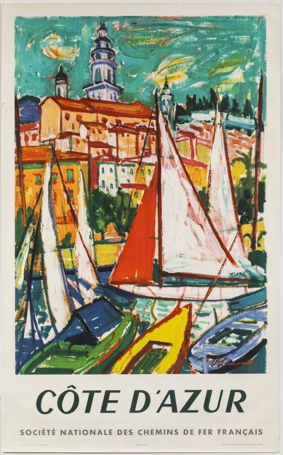 Tourism - Roger Marcel Limouse (1894-1989) - Côte d'Azur, French Railways. 1965. Printed by SNCF, Perceval, Paris. 99,3x62cm. Original lithograph and offset poster, canvas-backed. Condition A. The Société des Chemins de Fer Français commissioned Limouse to produce this composition depicting sailing boats in the port of Menton. We can admire the Saint-Michel-Archange basilica, which emerges from a fauvist green sky influenced by Matisse. A warm evocation of this emblematic town in the Alpes-Maritimes on the French Riviera.