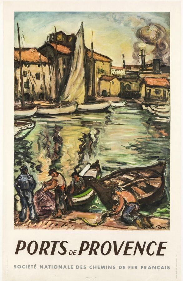 Tourism - Emile Othon Friesz (1849-1949) - Ports of Provence. 1949. Printers Perceval and SNCF. 99,5x63cm. Original poster, offset and lithograph, canvas covered. Condition A. This famous artist chose the port of Toulon in the Var to illustrate the ports of Provence. It should be noted that one of the boats represented is named Les Iles d'Or, a reference to Porquerolles.