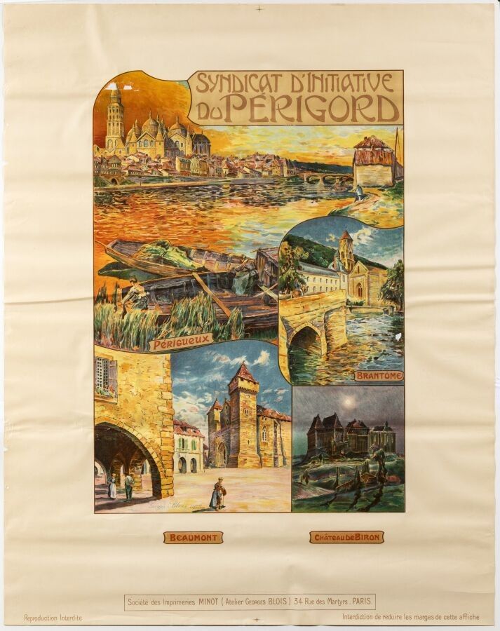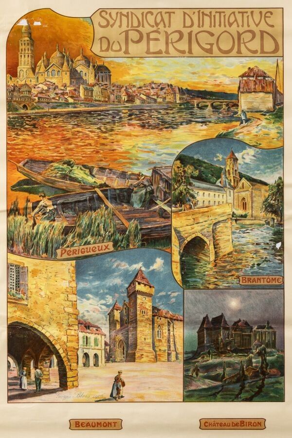 Tourism - Georges Blois (1869-1963) - Syndicat d'Initiative du Périgord, Périgueux, Brantôme, Beaumont, Château de Biron. 1906. Printed by Minot, 34 rue des Martyrs, Paris. 140 x 110.5 cm. Original lithographed poster, canvas-backed. Condition A-, minor tears. This is the very first tourist poster produced for the Dordogne. It is also the first poster to mention the margins, with a note in the lower right-hand corner: It is forbidden to reduce the margins of this poster. Georges Blois was exhibited at the Universal, International and Colonial Exhibition in Lyon in 1894 and at the Salon des artistes français in 1897 and 1898. His master was Edmond Marie Petitjean, who stayed with him in Razac-sur-l'Isle.