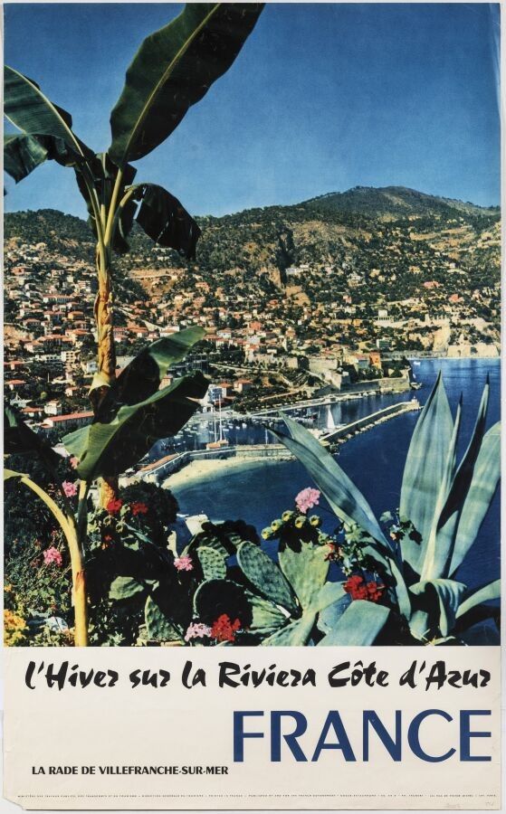 Tourism - Trubert (?) - Winter on the French Riviera. 1959. Printer Les Fils de Victor Michel, Paris. 98,5x63cm. Original poster, offset and lithograph, canvas-backed. Condition A-, traces of handling creases, missing lower right corner. The poster shows a spectacular view of the harbour of Villefranche sur Mer, a commune bordering Nice in the Alpes Maritimes, before dense urbanisation.