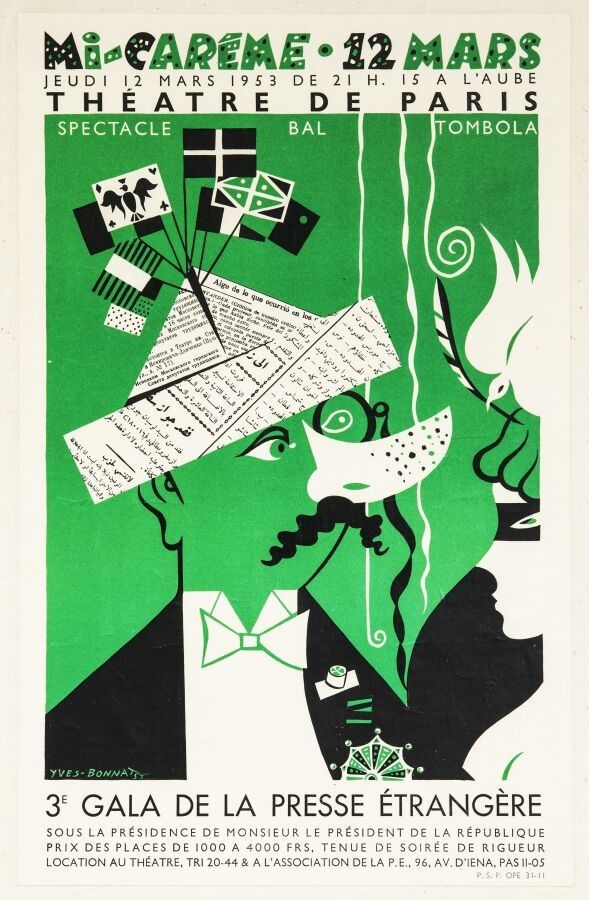 Show - Yves Bonnat (1912-1992) - 3rd foreign press gala at the Théâtre de Paris. 1953. 47,5x30cm. Original poster, lithograph, canvas-backed. Condition A, small traces of handling creases.
