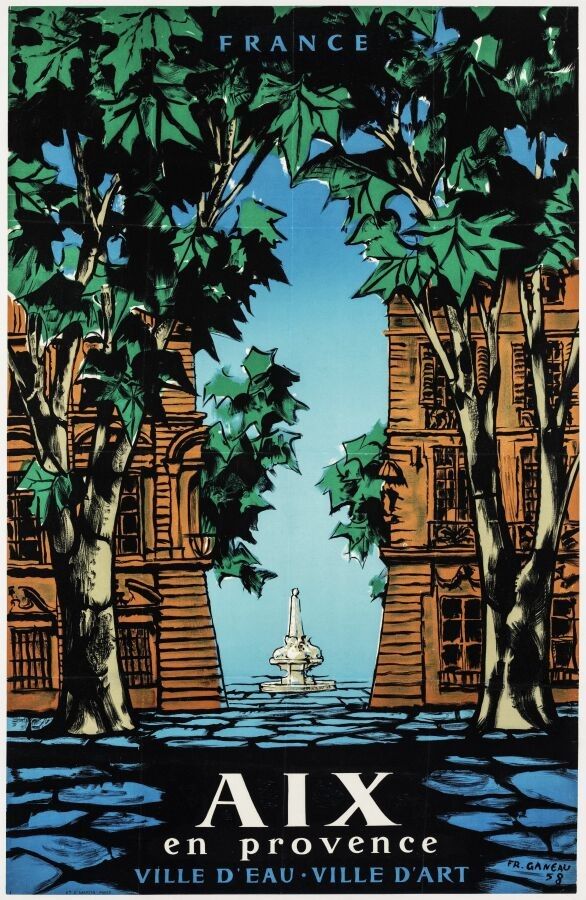 Tourism - François Ganeau (1912-1983) - Aix en Provence, ville d'eau, ville d'art. 1958. Printed by Saint Martin, Paris. 100x64cm. Original poster, lithograph, canvas-backed. Condition A-, traces of folds.