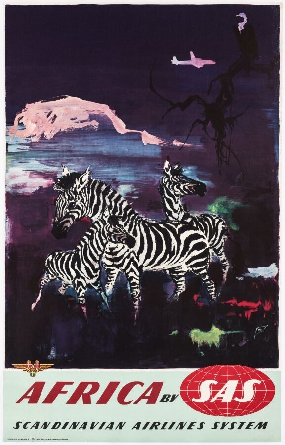 Tourism - Otto Nielsen (1916-2000) - Africa by SAS. Circa 1960. Printer Axel Andreasen & Sonner. 99,5x63cm. Original poster, offset, canvas covered. Condition A. Zebras and Mount Kilimanjaro are evoked in a semi-abstract way in the night under the silhouette of a Scandinavian airline plane. Although this visual may conjure up images of Tanzania or Kenya, the artist has chosen this synthesis to evoke the entire continent.