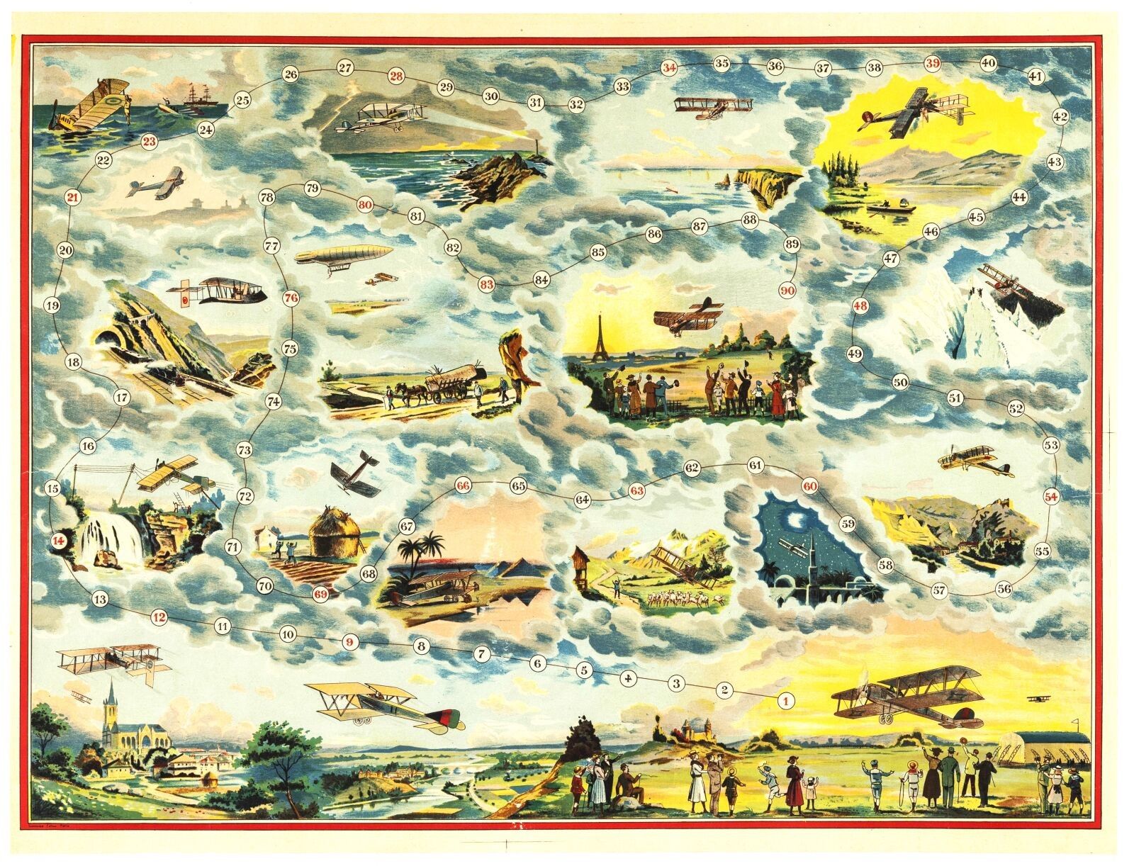 Aviation - Léon Saussine (?) - The air race. 1915. 64x80cm. Canvas game board. Condition A. One copy is kept in the Somme archives. This games publisher took part in the Universal Exhibition of 1878 and was a well-known manufacturer of educational and board games. Here he reports on the rapid progress of aviation which, since the first air show in 1909, has not failed to excite the crowds. Biplanes and airships are featured here.