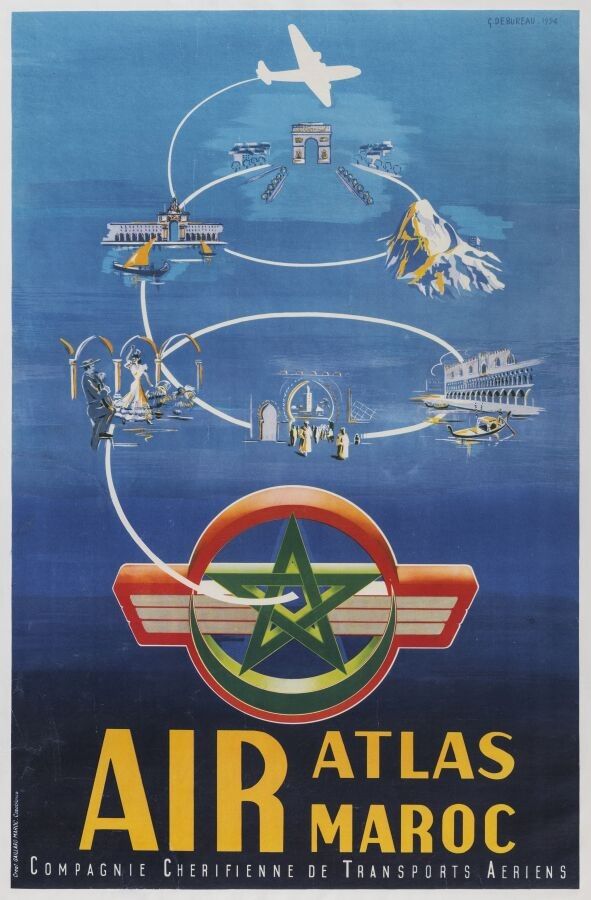 Tourism - G. Debureau (XX) - Air Atlas, Air Maroc. 1954. Printer Gaillard Maroc, Casablanca. 98 x63cm. Original poster, zinc, canvas. Condition A-, tears. Compagnie Chérifienne de Transports Aériens L'empire Chérifien was the name given to Morocco until 1957. The poster mentions several possible destinations, including Morocco, Venice, Spain and Paris.