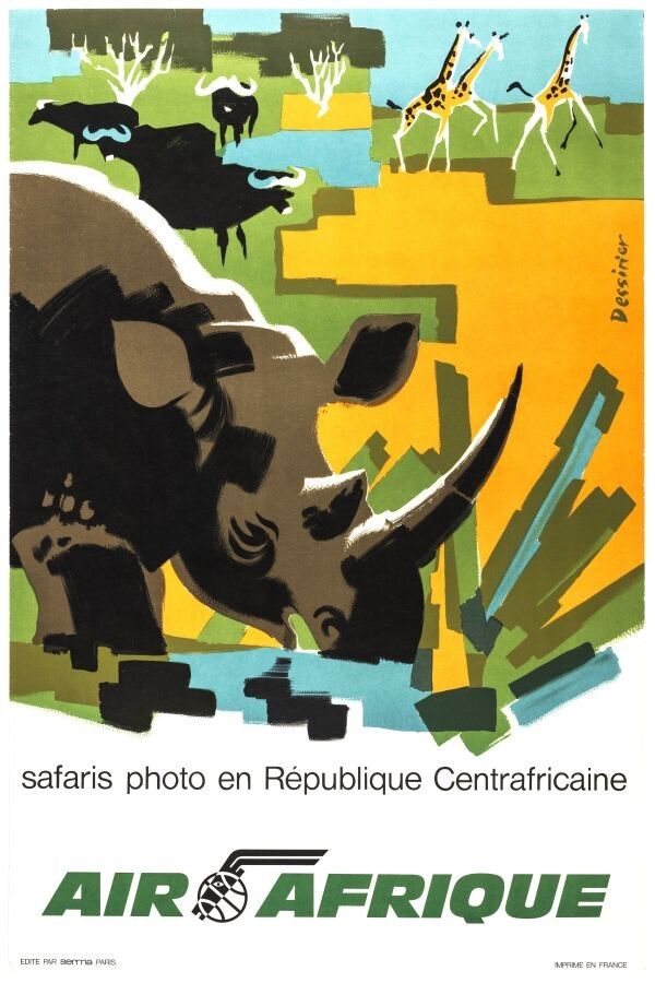 Tourism - René Dessirier (1919-2003) - Air Afrique, photo safaris in the Central African Republic. Circa 1950. Printed by Serma, Paris. 98.5x65cm. Original poster, lithograph, canvas covered. Condition A. Giraffes, buffaloes and a rhinoceros are featured in this poster promoting photo safaris in the savannah. This country is located between Chad, Sudan and Congo.