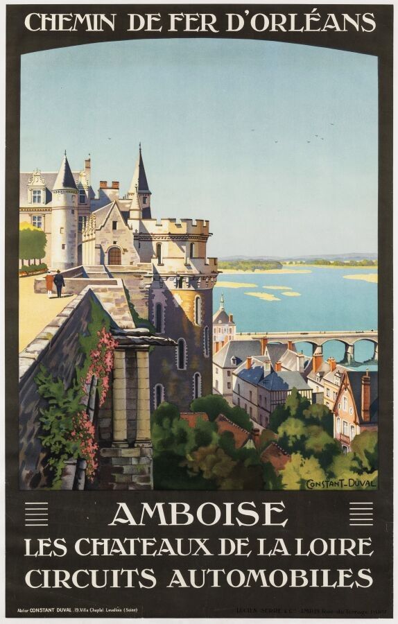 Tourism - Constant Duval (1877-1956) - Paris Orléans Railway. Amboise, Circuits Automobiles, Les Châteaux de la Loire. 1930. Imprimeur Champenois, Paris. 99x62,7cm. Original poster, lithograph, canvas-backed. Condition A- small traces of marginal tearing. Constant Duval's works are veritable paintings, not only because of the many colour passages on the stone, but also because of his great talent. It is interesting to note that from 1925 onwards, the train was associated with automobile tours to develop tourism in Indre et Loire. Of the two versions of posters created for Amboise by the artist, this one is the rarest and most beautiful, with the Loire in the background, resembling an inland sea.