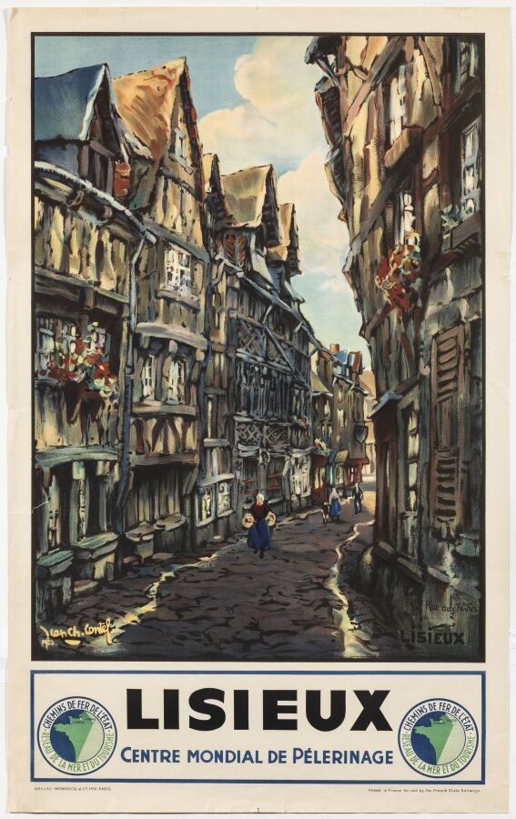 Tourism - Jean-Charles Contel (1895-1928) - State railway. Lisieux. 1923. Printer Gaillac Monrocq. 97,5x60cm. Original poster, lithograph, canvas-backed. Condition A-, restorations in the margins. This poster shows the Rue aux Févres as it was before the 1944 bombardment, with its typical half-timbered houses. This town in the Calvados region of Normandy is also renowned for its worship of and pilgrimage to Sainte Thérèse. The street flourished in the Middle Ages, when it became the street of metal craftsmen.
