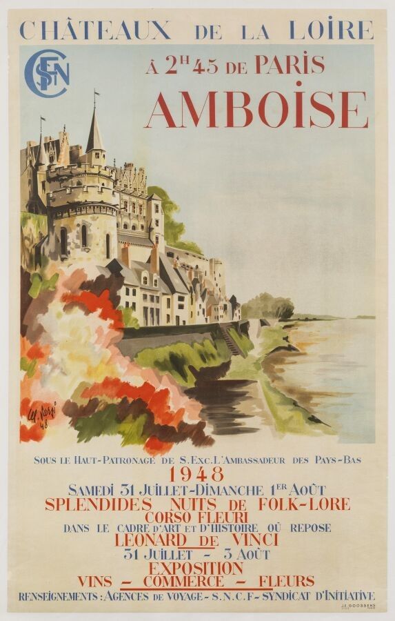 Tourism - Léo Varsi (XX) - Amboise, Car tours, Loire chateaux. 1948. Printed by Goossens, Paris. 98,5x62cm. Original poster, lithograph, canvas-backed. Condition A- minor edgewear. This exhibition in Indre et Loire was held under the patronage of His Excellency the Ambassador of the Netherlands.