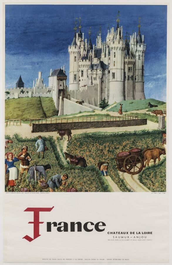 Tourism - Jacques Dubois (1912-1994) - France, chateaux of the Loire Valley, Saumur, Anjou. 1956. Draeger printer, Paris. 99.5x63cm. Original poster, Draeger process and lithography, canvas-backed. Condition A. Poster based on an illustration of the illuminated manuscript of the Très Riches Heures du Duc de Berry, kept at the Musée Condé in Chantilly. The building is located in Maine et Loire.