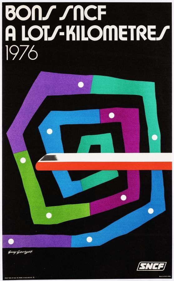 Tourism - Guy Georget (1911-1992) - SNCF lot-kilometre vouchers. 1975. Printed by SNCF, Paris. 100x61.5cm. Original poster, lithograph, canvas covered. Condition A. Guy Georget is known for his numerous posters but he also created the logo of the French post office, the aerogram. A copy of this poster is kept at the Bibliothèque Forney.