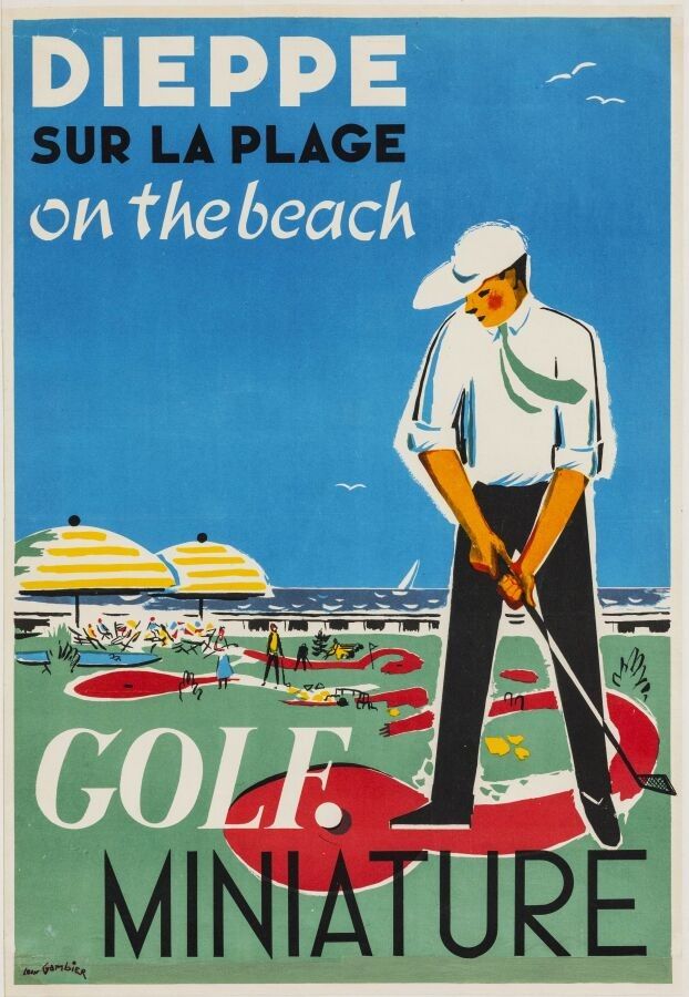 Tourism - Léon Gambier (1917-2007) - Dieppe sur la plage, on the beach, Miniature golf course. Circa 1958. 53x36.2cm. Original poster, offset, canvas (mounted on tab). Condition B+, lower margin restored over 1cm except on the signature. It's worth noting that in 1897 the English founded the oldest golf course in Normandy, from which players could enjoy an exceptional view of the Alabaster coast. So it was only natural that a few years later a mini-golf course was opened, which is still in operation today. The Seine Maritime seaside resort has retained its links with the English, as the bilingual poster shows.