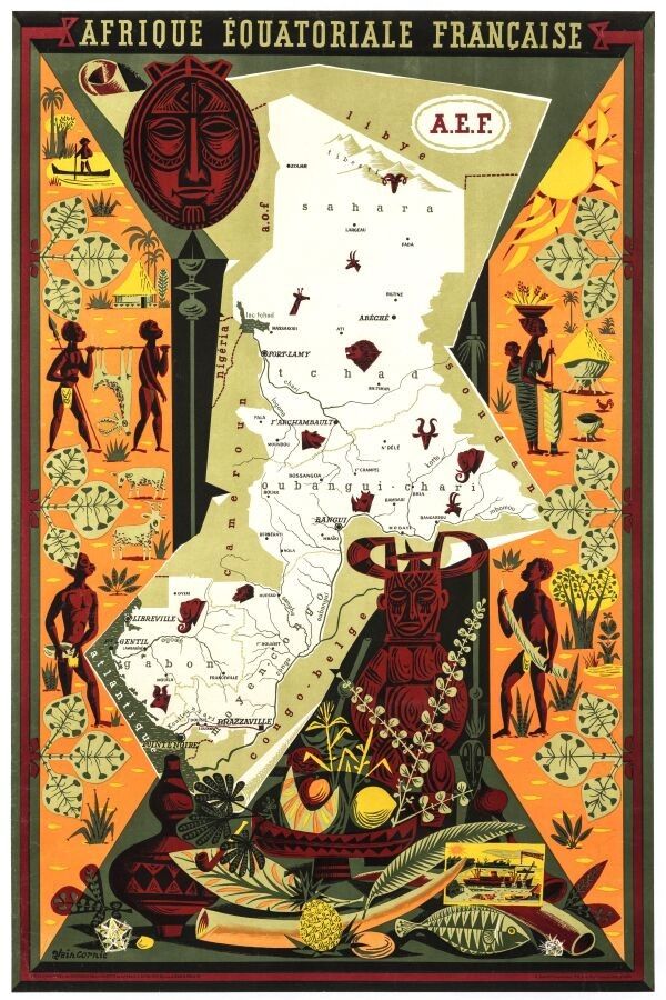 Tourism - Alain Cornic (1920-?) - French Equatorial Africa. Circa 1950. Printer Raidot, Paris. 117,5x77cm. Original poster, lithograph, canvas covered. Condition A-, small tears. AEF (Afrique-Équatoriale Française) was the name given to the general government created in 1910 to bring together in a federation the four French territories of equatorial Africa: Gabon, Moyen-Congo (now Congo-Brazzaville), Oubangui-Chari (now the Central African Republic) and Chad. In the style of Lucien Boucher, the artist presents a map of the AEF, surrounded by treasures of primitive art.