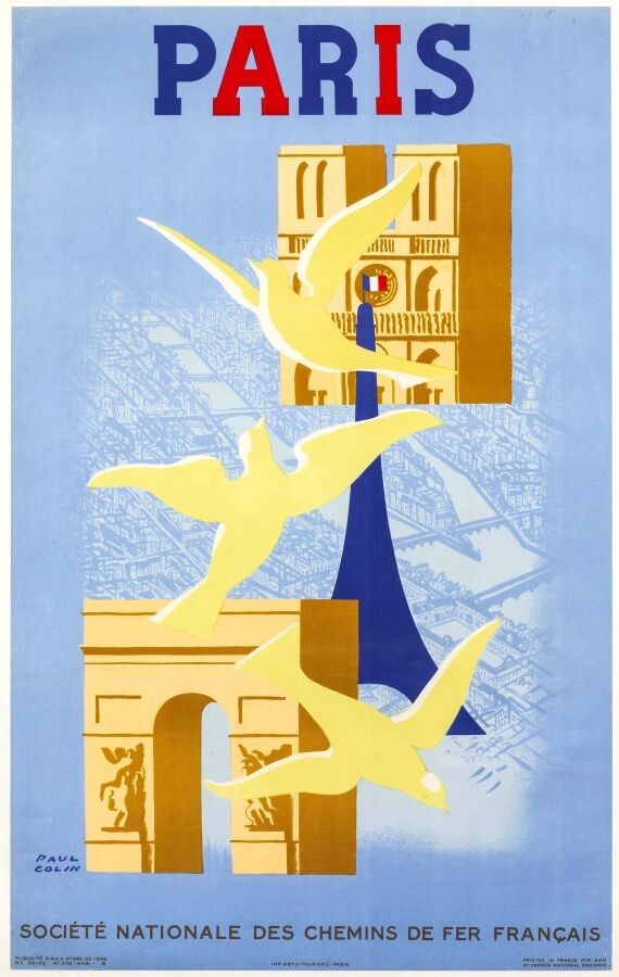 Tourism - Paul Colin (1892-1985) - Paris. 1946. Printed by SNCF, Paris. 99.5x62.5cm. Original poster, lithograph, canvas-backed. Condition A-, some traces of folds. Notre Dame Cathedral, the Eiffel Tower, the Arc de Triomphe in front of doves of peace. In addition to being a great success, this poster is a historical document illustrating the Liberation of Paris.