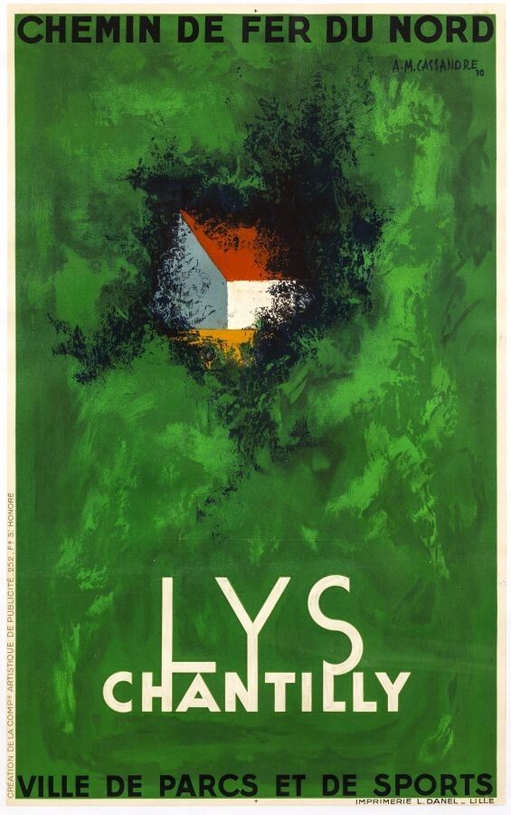 Tourism - Adolphe Mouron Cassandre (1901-1968) - Chemin de fer du nord, Lys Chantilly. 1930. Printer Danel, Lille. 100x62.5cm. Original poster, lithograph, canvas covered. Condition A. The Domaine du Lys is located in the Oise department, straddling the communes of Lamorlaye and Gouvieux. It was once part of the Chantilly estate until it was sold by the Duc d'Aumale and became a housing estate in 1924. It was for this reason that Cassandre was approached, with the express request of highlighting the abundant nature of this new 'city of parks'. Note the typography of the word "LYS". These three letters were slightly redesigned 31 years later to create the iconic Yves Saint Laurent logo.