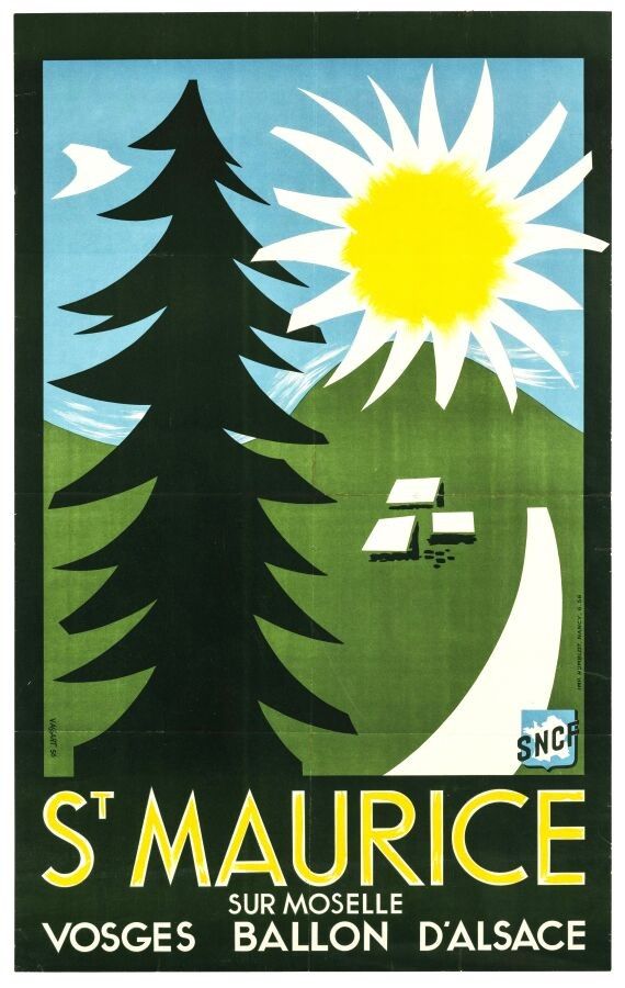 Tourism - Vassart (XX) - SNCF, Saint Maurice sur Moselle, Vosges, Ballon d'Alsace. 1956. Printer Humblot, Nancy. 99x61,5cm. Original poster, lithograph, canvas covered. Condition A-, folds. This Lorraine commune, at the foot of a famous mountain, is a popular ski resort.