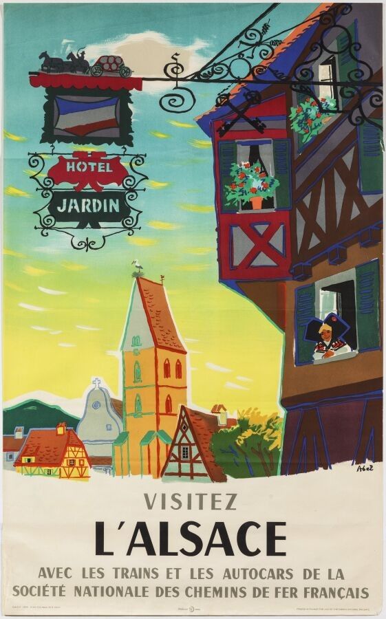 Tourism - Henri Sjöberg dit Abel (1910-2000) - SNCF, Visit Alsace. 1956. Printer SJ, Paris.98x61,5cm. Original poster, lithograph, canvas. Condition A. Abel graduated from the ENSBA and joined Draeger before founding the Seuil publishing house with his wife Jeanne Sjöberg. Here he depicts a picturesque view, more precisely of Eguisheim in the Haut Rhin and its bell tower on which there is always a stork's nest!