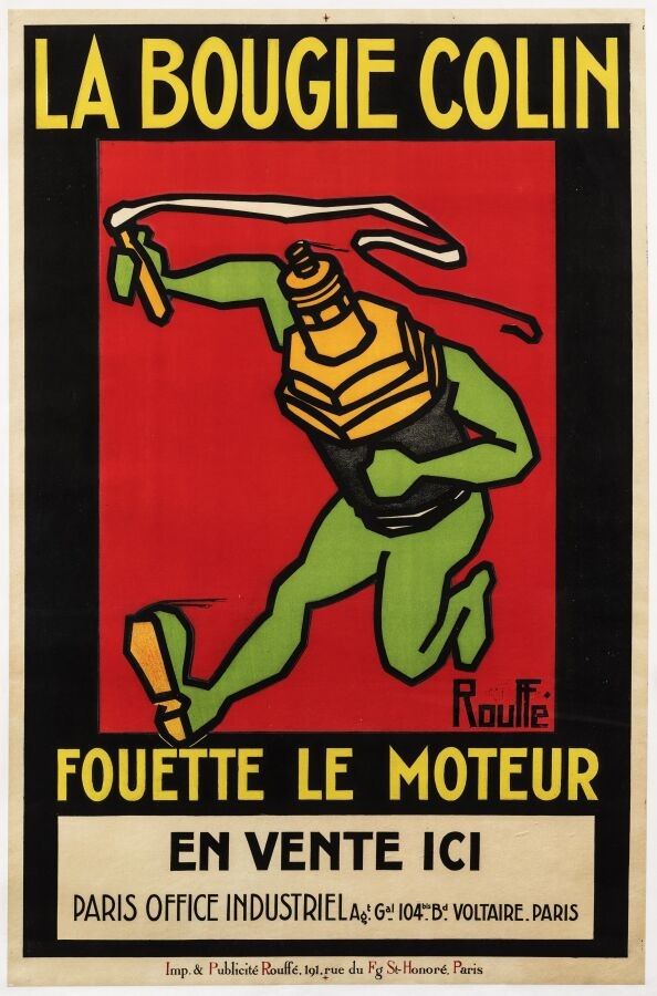 Automobilia - Rouffé (XX) - The Colin Candle. Circa 1930. Printer Rouffé, Paris. 116x75,5cm. Original poster, lithograph, canvas covered. Condition A. The excellent graphic design of this poster is reminiscent of Jossot and his black rings. The candle was sold at 104 bis Boulevard Voltaire in Paris. This element reminds us of the importance of the development of the internal combustion engine, and the arrival of the hegemony of oil.