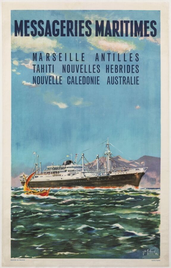 Tourism - Jean des Gachons (1871-1951) - Messageries Maritimes, Marseille, West Indies, Tahiti, New Hebrides, New Caledonia, Australia. 1958. Printer Edita, Paris. 99x63cm. Original poster, offset, canvas-backed. Condition A-, traces of folds. The ship named, Le Calédonien, shown on this poster was commissioned in 1952. In August 1956, the year of our poster, it carried General de Gaulle from Fort-de-France to Nouméa.