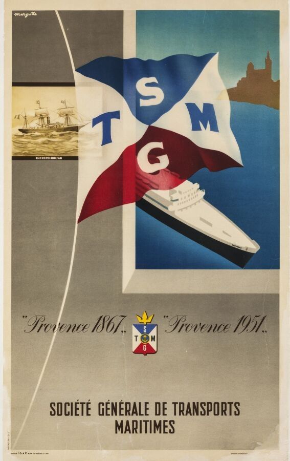 Tourism - Margutte (XX) - Société Générale des transports Maritimes.1951. Printed by IGAP, Rome. 92.5x61cm. Original poster, offset, canvas-backed. Condition B+, traces of folds, margins restored. The poster depicts the ships Provence 1897 and Provence 1951. The latter was mainly used on the South transatlantic line: Le Havre - Lisbon - Pointe-à-Pitre - Fort-de-France. It was also used for cruises. Like its twins, it was intended for voyages like those of the Liberté or the future France (1962), which were important for linking mainland France with the West Indies and South America.