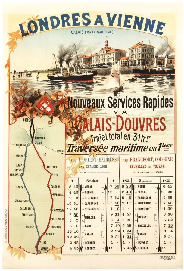 Tourism - Gustave Fraipont (1849-1923) attributed to - London to Vienna via Calais-Dover. Circa 1890. Printer Fraipont et Moreau, Paris. 95x65cm. Original poster, chromolithograph, canvas covered. Condition A. Prestigious poster illustrating the fast rail and sea services linking England to Austria via Calais-Dover and the Orient-Express. The central scene shows the Calais ferry terminal bustling with steamers and sailing ships, while a map details the European stops: Boulogne, Amiens, Lille, Brussels, Liège, Cologne, Frankfurt, Munich, Vienna... This composition highlights the strategic role of the port of Calais and the north of France in international tourism during the Belle Époque and its connection with the Orient Express. A rare and emblematic piece of maritime travel and regionalism.