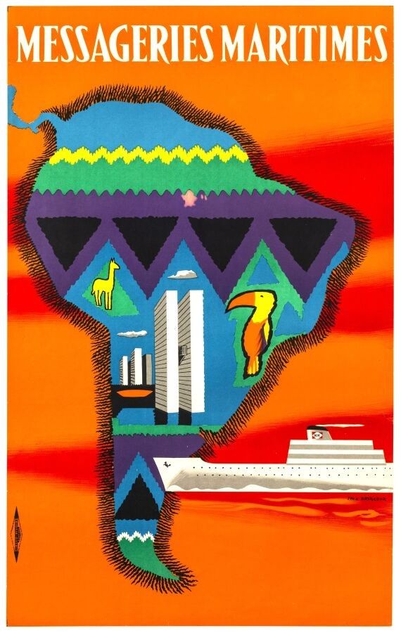 Tourism - Jean Desaleux (1926-1990) - Messageries Maritimes. Circa 1960. 99x62 cm. Original poster, offset, canvas. Printed by Giraud, Rivoire. Condition A. This colourful and stylised composition highlights South America in the form of a map on an aguayo, a traditional Andean canvas emblematic of Bolivia and Peru. The poster incorporates symbols such as the toucan and llama, the towers and dome of Brasília (Oscar Niemeyer), while the airline's white liner stands out against a flamboyant orange background. A testament to the modernity and tourist appeal of Latin America in the 1960s, the poster illustrates the expansion of transatlantic lines to Brazil, Argentina and Chile. It is representative of the graphic communications of post-war shipping companies, at the crossroads of modernist design and the exotic imagination.