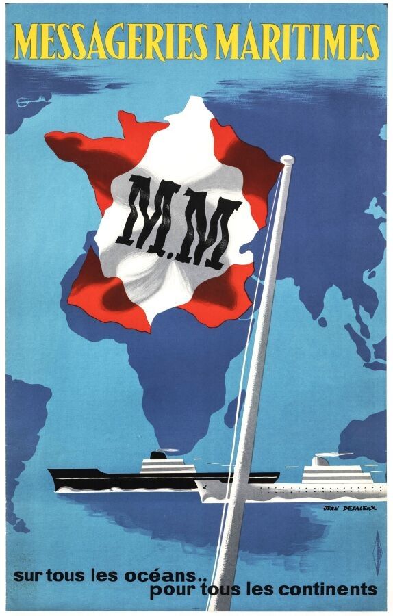 Tourism - Jean Desaleux (1926-1990) - Messageries Maritimes, On all the oceans..for all the continents. Circa 1960. 99x64 cm. Original poster, lithograph, canvas. Printed by Giraud, Rivoire. Condition A. This colourful modernist poster shows a world map with two ocean liners and a flag in the shape of the map of France in front of it, marked with the seal of the Compagnie Messageries Maritimes.