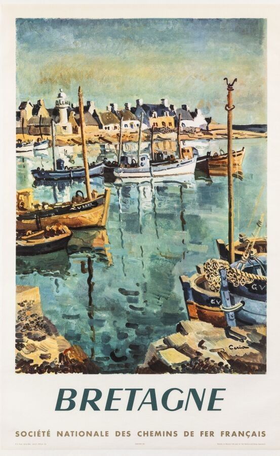 Tourism - Cariou (XX) - SNCF, Brittany. 1970. Draeger printer. 99x62cm. Original poster, Draeger process, canvas covered. Condition A. The artist transports us to a small port in Brittany with its boats and sardine boats, traditional houses and lighthouse.