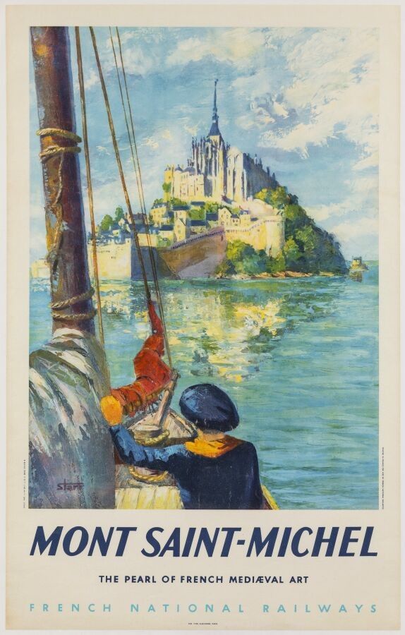 Tourism - Starr (XX) - SNCF, Mont Saint-Michel. 1947. Printed by SNCF. 99x63cm. Original poster, offset, canvas covered. Condition A. It is interesting to see the Mont Saint-Michel in 1947 but also to note that Starr unconsciously or not used the same composition as Hergé in 1938 for the cover of the Île Noire.