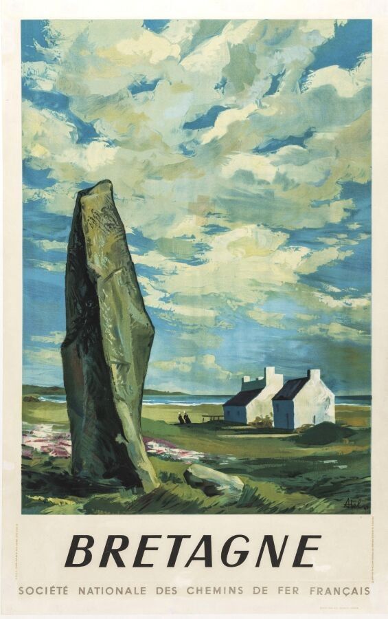 Tourism - Henri Sjöberg known as Abel (1910-2000) - SNCF, Brittany. 1946. Printer Dupuis, Paris.98x61,5cm. Original poster, lithograph, canvas-backed. Condition A- a trace of fold and marginal restorations. After graduating from the ENSBA, Abel worked for Draeger before founding the Seuil publishing house with his wife Jeanne Sjöberg. A gigantic menhir stands in the foreground of this poster, evoking the Neolithic era and the many vestiges that remain.