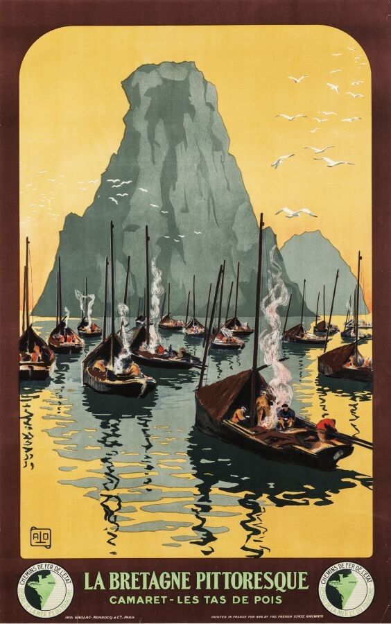 Tourism - Charles Hallo (1882-1969) dit Alo - La Bretagne Pittoresque, Camaret, Les tas de Pois. 1934. Printer Gaillac, Monrocq, Paris. 99,5x62,5cm. Original poster, lithograph, canvas covered. Condition A. Finistère. The poster depicts sardine boats being winched. The artist, like Henri Rivière, offers us an oriental view of the pointe de Pen-hir.