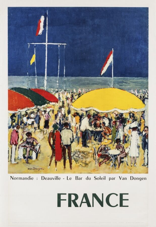 Tourism - Kees Van Dongen (1877-1968) - Normandy: Deauville, Le bar du soleil, France. Circa 1960. Printer SNCF, Braun, Mulhouse, Paris. 98,5x63cm. Original poster, lithograph and chromolithograph, canvas covered. Condition A. Reference: Archives du Calvados, Cote 25FI/325.
