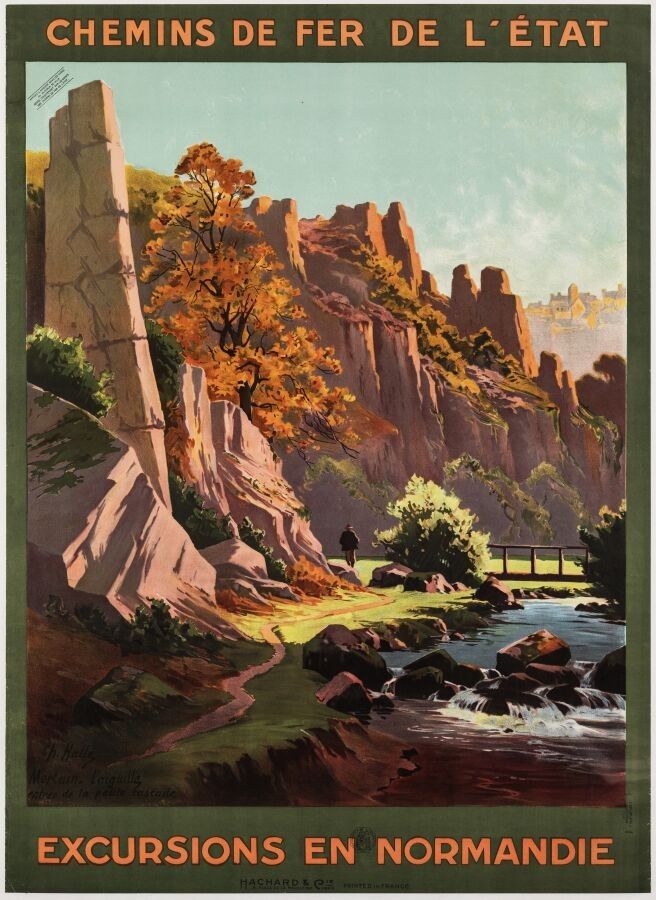 Tourism - Charles Hallé (1867-1924) - State Railways, Excursions in Normandy. Circa 1925. Printer Hachard, Paris. 104.5x75.5cm. Original poster, lithograph, canvas-backed. Condition A. "Mortain - L'aiguille, entrée de la petite cascade (Manche)". The artist added this below his signature because he probably drew on the spot. It is still a popular tourist destination. Legend has it that a pond once occupied the valley floor. It was here that the local nymphs took their baths away from prying eyes. Anyone who had the audacity to sneak up on them would have been condemned to death. One day, however, Leonix, a young and attractive warrior, managed to get close to them. As soon as the Cance nymph was overcome with rage, she rushed towards him and in one swift movement struck him violently with the spindle she held in her hand. Leonix collapsed, the earth split open to swallow his body and the nymph's spindle, which had remained stuck in the chest of the valiant warrior, was transformed into the stone we see today, known as the Aiguille or Fuseau.