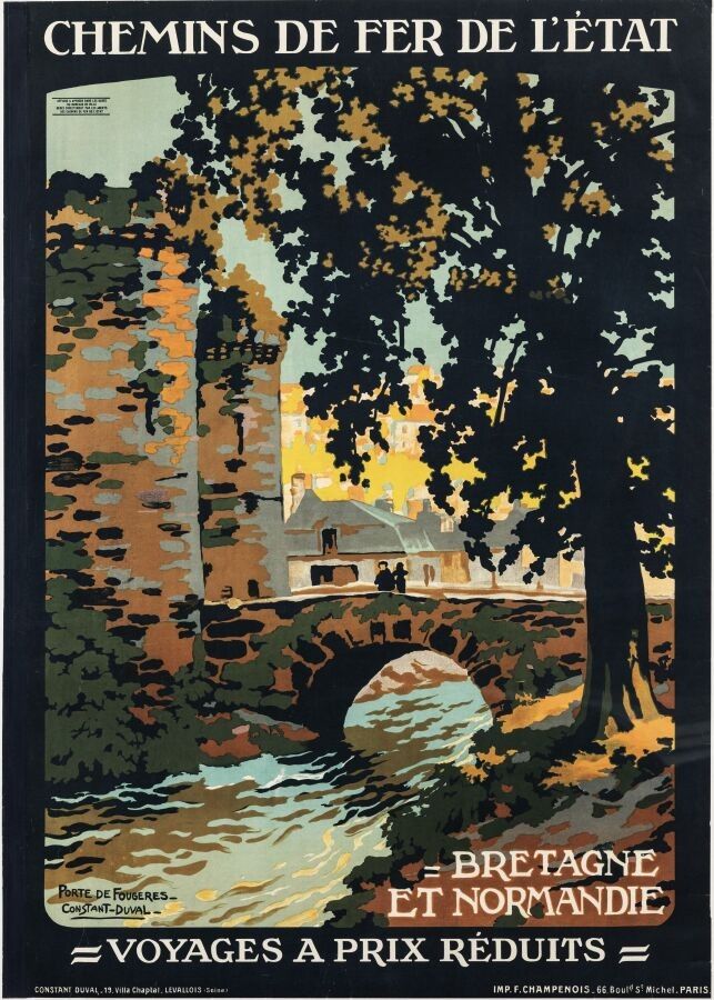 Tourism - Constant Duval (1877-1956) - State railway. Brittany and Normandy, Porte de Fougères. Circa 1920. Printer Champenois, Paris. 100x62.5cm. Original poster, lithograph, canvas-backed. Condition A-, restorations in the left margin. This Porte Notre-Dame is part of the medieval castle in this Ille et Vilaine village.