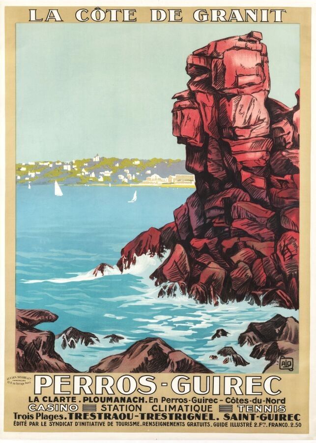 Tourism - Charles Hallo dit Alo (1882-1969) - The Granite Coast, Perros Guirec. Circa 1928. Printer Lucien Serre, Paris. 104x74.5cm. Original poster, lithograph, canvas covered. Condition A. This rare poster promotes a part of the Côtes d'Armor in Brittany including La Clarté, Ploumanach, Trestraou-Trestrignel, but also Tennis and the Casino. Perros-Guirec, a renowned seaside resort for over a hundred years, is set in a remarkable, unspoilt natural environment. This unique landscape where the sea and beaches are dotted with monumental blocks of pink granite sculpted by the wind, as the poster aptly shows.
