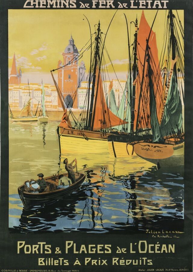 Tourism - Julien Lacaze (1886-1971) - Ports & Plages de L'Océan, La Rochelle. 1913. Printer Cornille & Serre, Paris. 107x73.5cm. Original poster, lithograph, canvas-backed. Condition A-, tears, folds. Extraordinary effects of light and reflections on the old port and the fishing boats of this town in Charente Maritime, we can feel the influence of Auguste Renoir, master of Impressionism and Julien Lacaze.